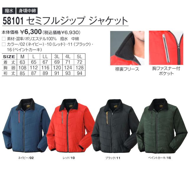 58101 セミフルジップ ジャケット(撥水・身頃中綿)