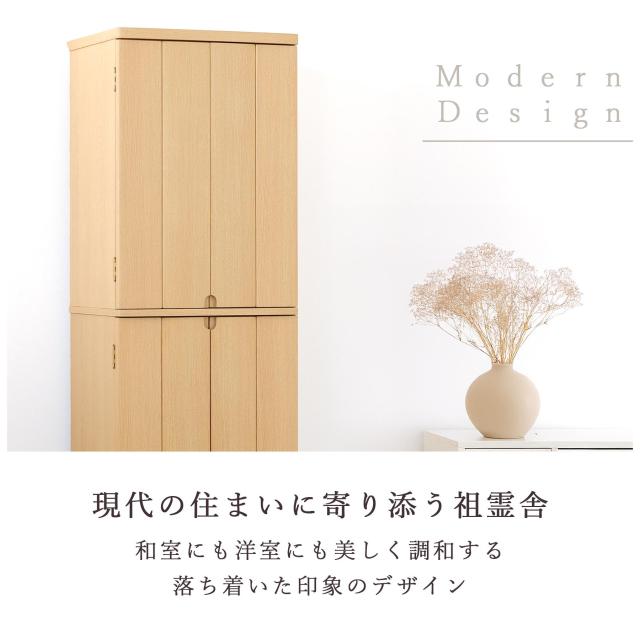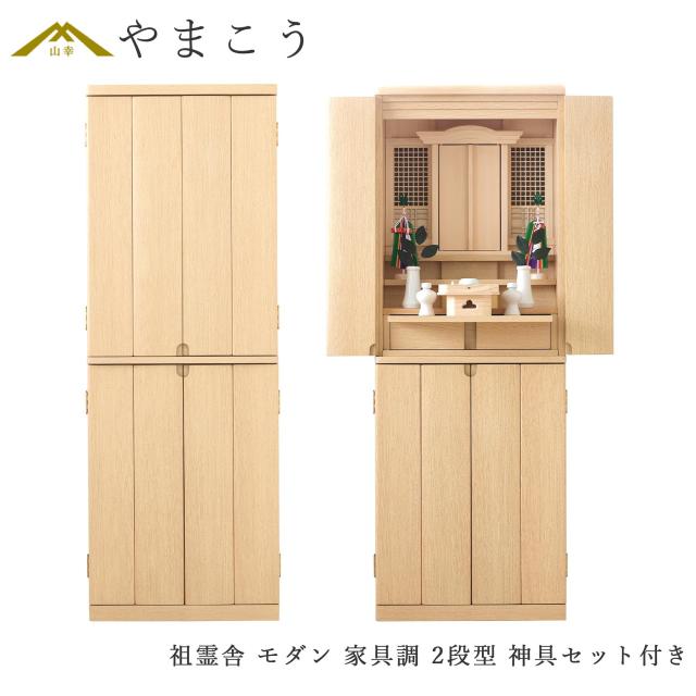 祖霊舎 神徒壇 神具付き モダン 家具調 2段型 台付 収納付き 床置き ライト・タモ カラー 高さ135cm×幅49cm 神道 祖霊社 セット 神棚 神具 (代引き決済不可商品)