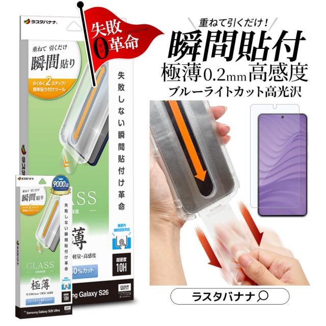 Galaxy S26 S26 Ultra ガラスフィルム 全面保護 ブルーライトカット 高光沢 貼付革命 貼り付け革命 瞬間張り 失敗しない レボリューション 指紋認証対応 簡単貼り付けツール付き 極薄 薄型 高感度 0.2mm 硬度10H ギャラクシー ウルトラ 保護フィルム ラスタバナナ