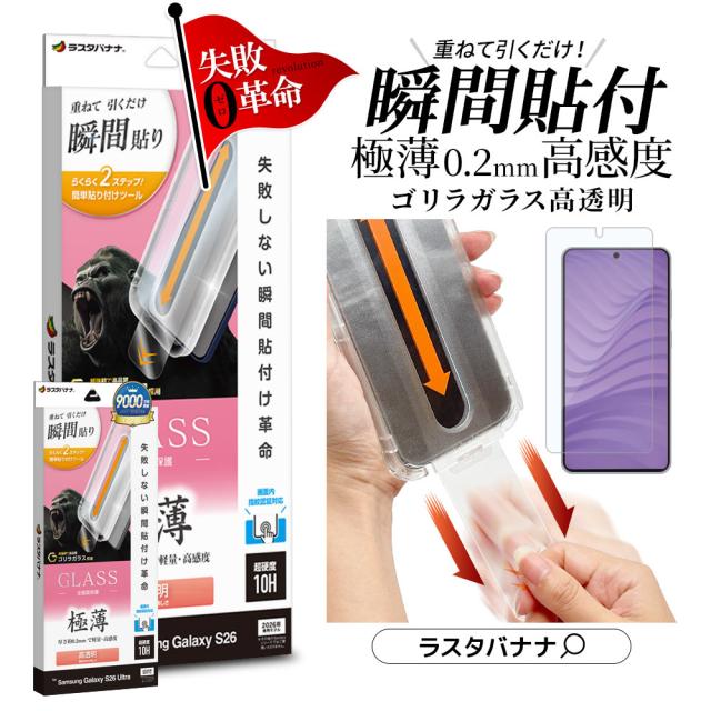 Galaxy S26 S26 Ultra ガラスフィルム 全面保護 高光沢 高透明 クリア ゴリラガラス採用 貼付革命 貼り付け革命 瞬間張り 失敗しない レボリューション 指紋認証対応 簡単貼り付けツール付き 極薄 薄型 高感度 0.2mm 硬度10H ギャラクシー 保護フィルム ラスタバナナ