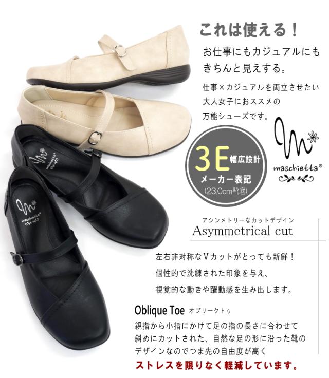 パンプス ストラップ レディース 柔らかい カカト踏める 2WAY マスチェッタ アシンメトリー オブリークトゥ フラットソール 軽い 耐滑 立体クッション 仕事 カジュアル 屈曲 3E
