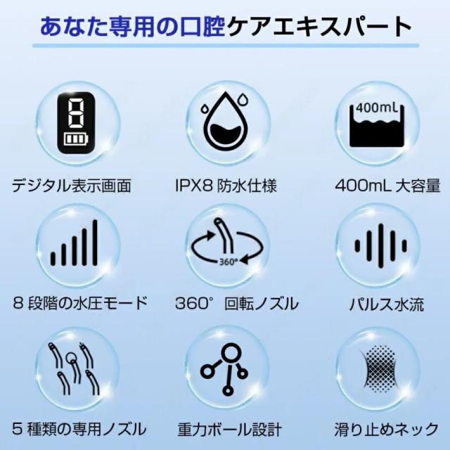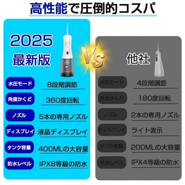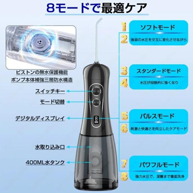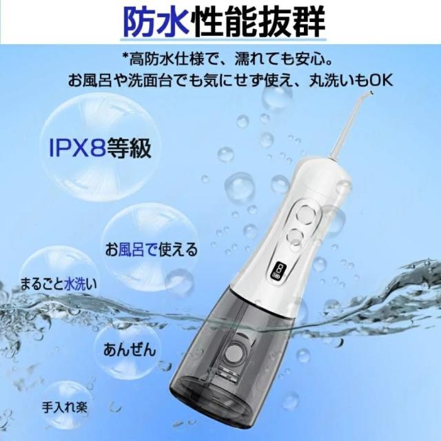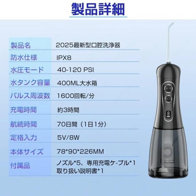 【2025年最新モデル】口腔洗浄器 ジェットウォッシャー 高圧 デンタルケア IPX8防水 8段階水圧 5種ノズル 400ml大容量タンク デジタル表示 USB充電式 携帯用 旅行 プレゼント 2年保証