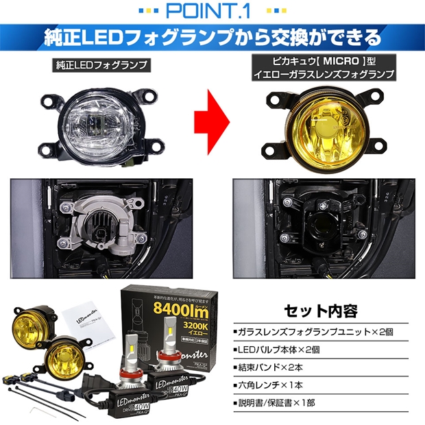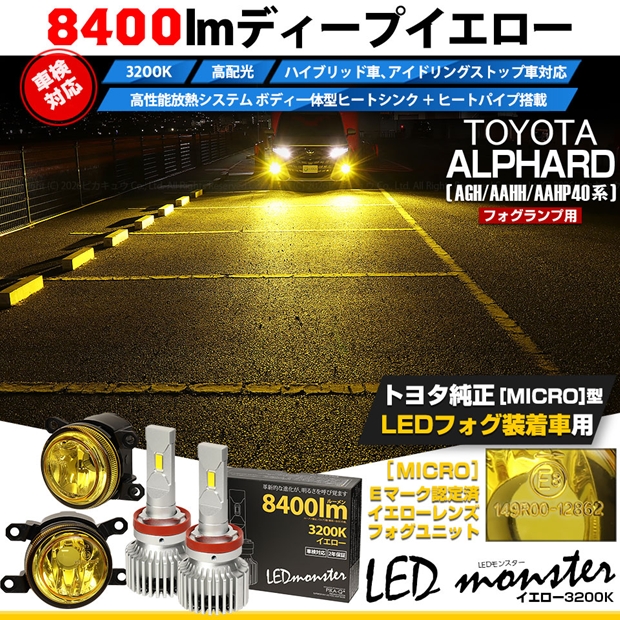 トヨタ アルファード (AGH/AAHH/AAHP40系)対応 H11 led MICRO LED MONSTER L8400 イエローガラスレンズフォグランプキット 8400lm 黄色 44-H-5