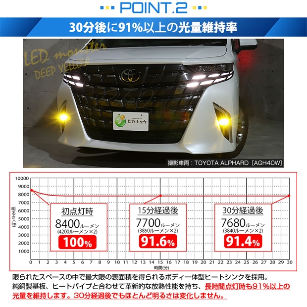 明るさ全光束8400ルーメンの最強のモンスターフォグランプLEDバルブです。放熱性能が高いため、長時間点灯後も91%以上の光量を維持します。30分経過後もほとんど明るさが変化しない放熱対策を施しています。純正球の配光特性に徹底的にこだわり、理想的な配光を実現しています。