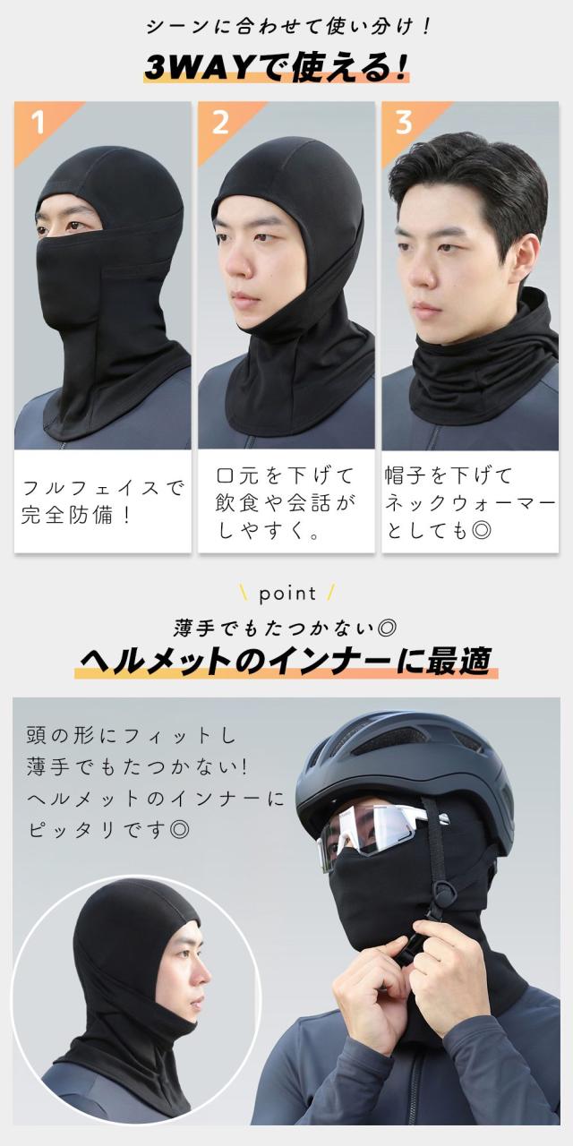 目出し帽・フェイスマスク・ネックウォーマーとして使える3way仕様。シーンに合わせて口元を下げたり、帽子部分を下げて首元を重点的に防寒したりと自由自在。通勤・通学、自転車やバイク走行、アウトドアまで幅広く活躍します。