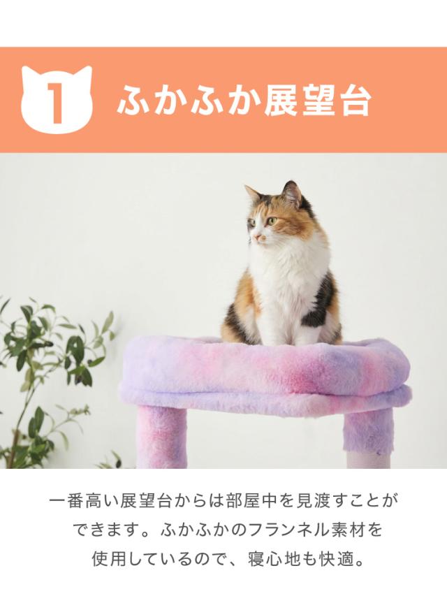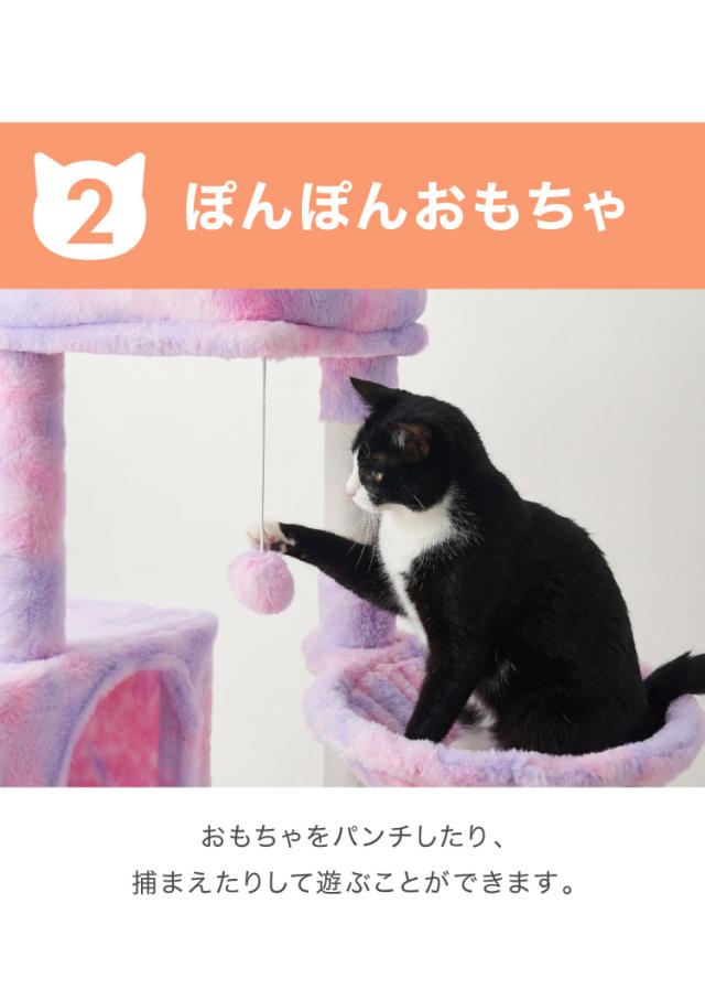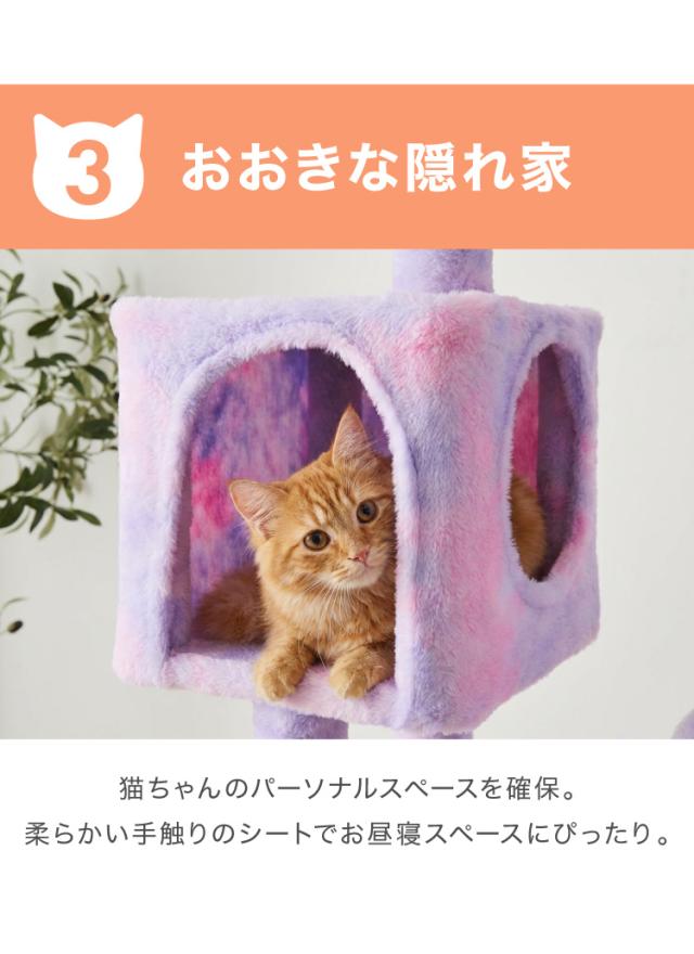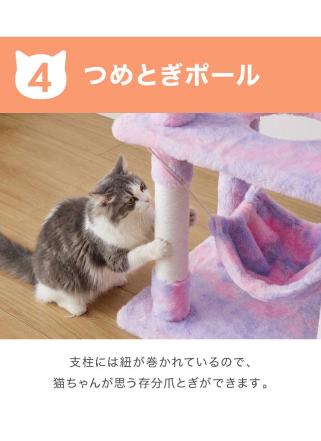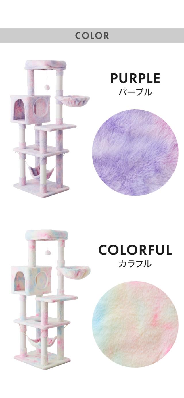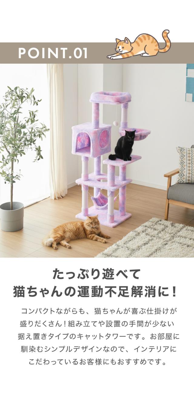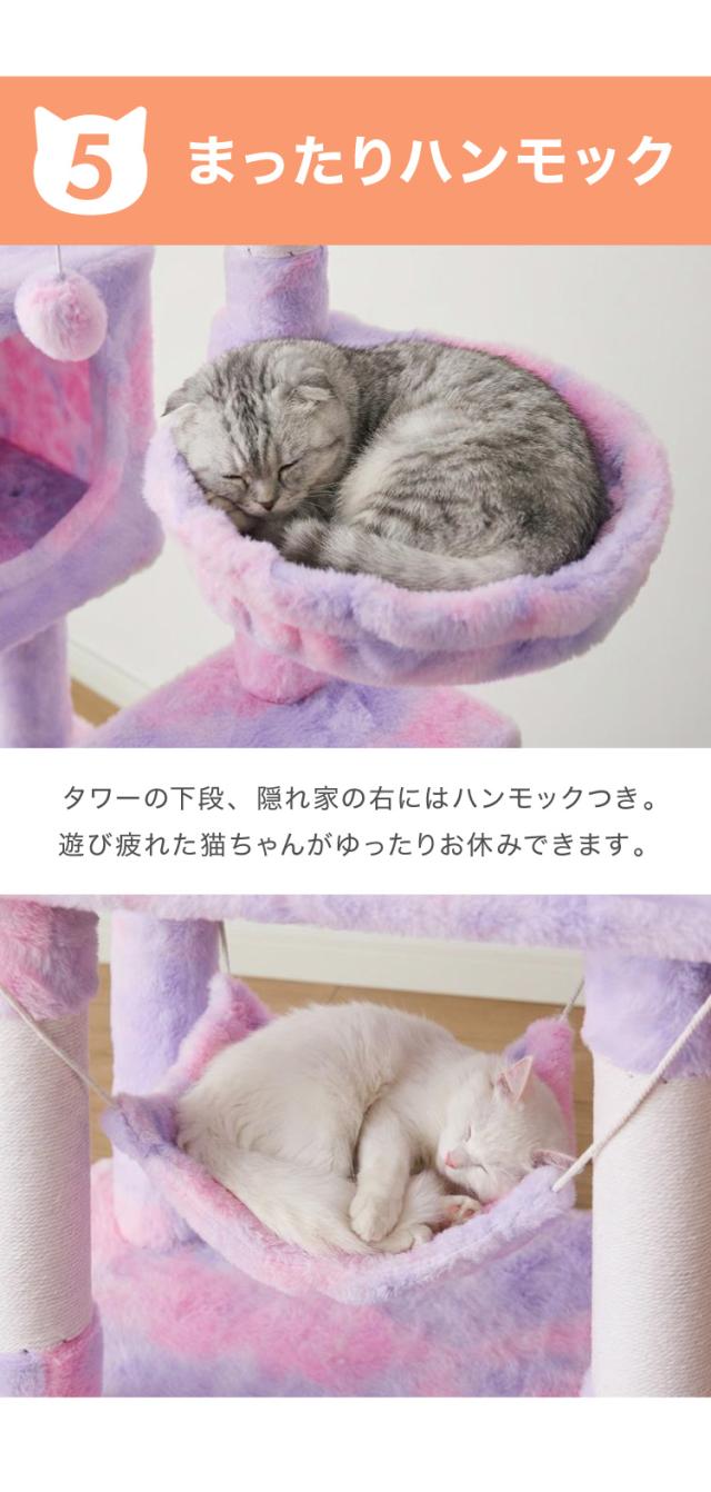 キャットタワー、キャットハウス、キャットツリー、猫タワー、据え置き、ハウス、ハンモック、猫、ねこ、ネコ、爪とぎ、つめとぎ、ベッド、おもちゃ、多頭飼い、シンプル、かわいい、インテリア、ペット、ペット用品、猫用品、省スペース、置き型、低ホルムアルデヒド、エコテックス、FSC認証、頑丈、安定、紫、運動不足、ストレス解消