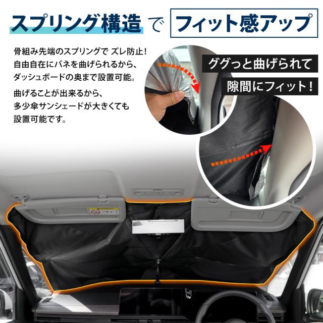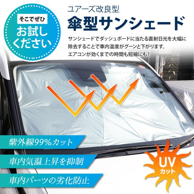 暑さを忘れて眠たくなる涼しさ! 車種適合の改良版傘型サンシェード お客様のお声を参考に、従来品からコストをかけて徹底的に改良しました! ★改良ポイント1:2層構造採用 いままで設置時にダッシュボードや内装に当たってしまっていた骨組みを、覆い隠すように裏生地も取り付けることで、傷を防止! 骨組みが隠れることで見た目もスッキリとした印象に♪ 表地と裏地の間に空気層が生まれることで、断熱効果も期待できます。 ★改良ポイント2:骨組み先端にスプリング構造 従来品は骨組みが固く、設置時にダッシュボードを引きずって傷がつくことも…。 改良版は先端にバネを付けることで、衝撃を和らげて傷が付きにくくなりました! 骨組み先端のスプリングで ズレ防止!自由自在にバネを曲げられるから、ダッシュボードの奥まで設置可能。 曲げることが出来るから、多少傘サンシェードが大きくても設置可能です。 ★改良ポイント3:根本から曲がる短めシャフト 改良版は根元からしっかりと曲がるから、自由度アップ! バイザー固定などでシャフトの支えが不要な場合には折り曲げて宙に浮かせると、邪魔にならずに内装にも傷がつきません。 ============================= ●お車に取り付けやすい 360°曲がるフレキシブルシャフト&3段階伸縮で車に合わせて調整できる! ミラーポケット付きなので、今までルームミラーが干渉して取付できなかったお車でもV字の開口部にルームミラーをスポッと差し込めるので装着しやすくなっています またマジックテープもついているので、サンシェードの固定にもなります。 ※車種によってルームミラーに取り付けできない場合があります ●傷が入りにくいハンドル保護グリップ ハンドル部分には、熱に強く柔らかいシリコン製エアーポンプグリップを採用。 ぷにぷにとして柔らかいので、ハンドルがダッシュボードや内装・ナビに当たって傷にならないので安心です! ●紫外線を99%カット! サンシェード外側の複合チタン銀コーティングは光の屈折率が高いシェード表面素材は、紫外線を99%遮断して高い断熱能力を発揮します。 駐車時間の車内気温上昇を大幅に抑制したり、車内の内装やシートの劣化、熱変形なども防ぎます。 シェード布地は裏面を黒にしたリバース構造にすることで紫外線や熱エネルギーの反射効果を向上します! ●凹面10本骨構造 シェードの親骨はグラスファイバー繊維を使用。弾力性があり、狭い箇所での設置や調整しやすくなります。簡単に折れにくく耐久性にも優れており、繰り返してご使用いただけます。 |