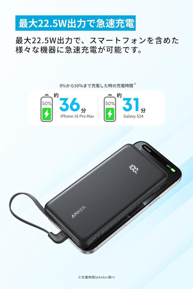 最大22.5W出力で、スマートフォンを含めた様々な機器に急速充電が可能です。