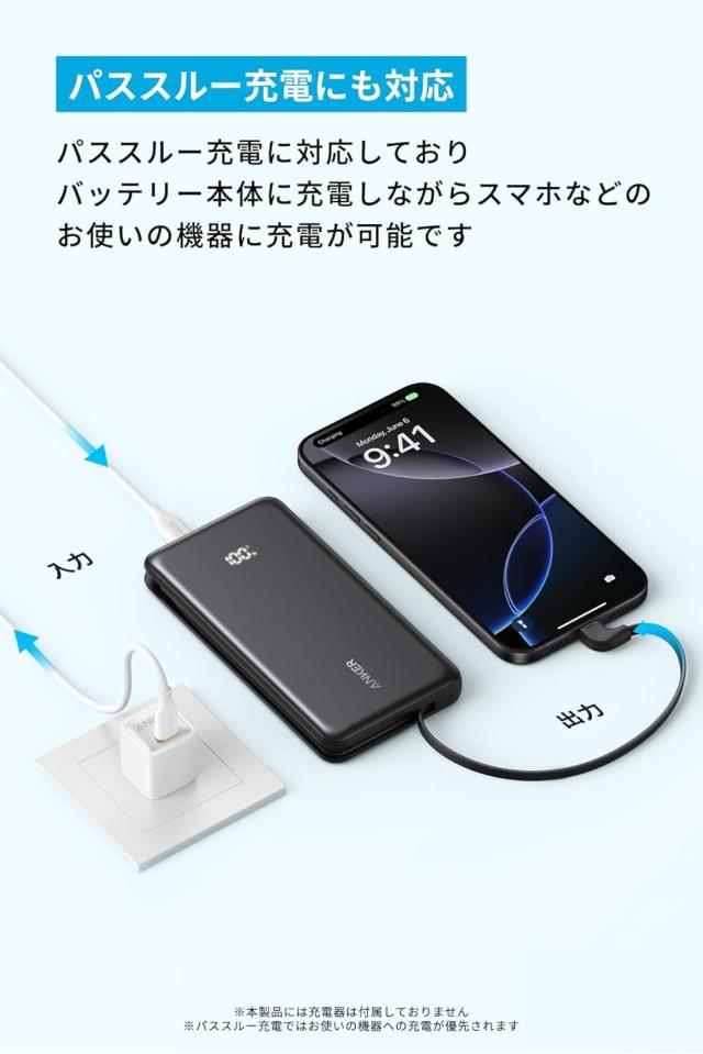 パススルー充電に対応しており、バッテリー本体に充電しながらスマホなどのお使いの機器に充電が可能です。