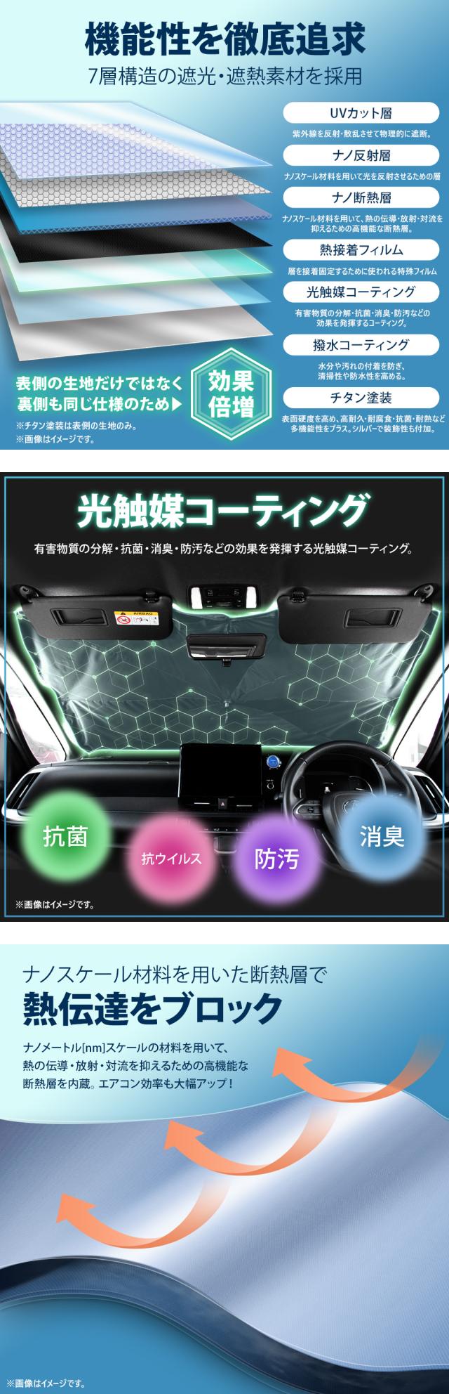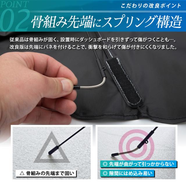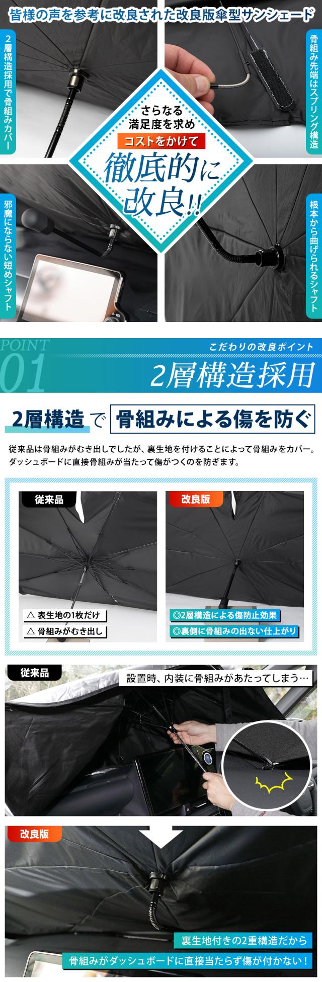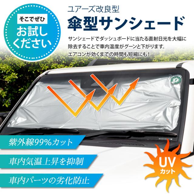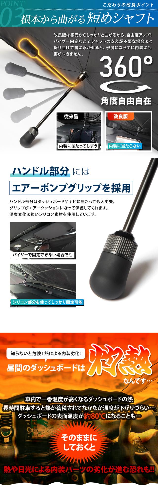 暑さを忘れて眠たくなる涼しさ! 車種適合の改良版傘型サンシェード お客様のお声を参考に、従来品からコストをかけて徹底的に改良しました! ★改良ポイント1:2層構造採用 いままで設置時にダッシュボードや内装に当たってしまっていた骨組みを、覆い隠すように裏生地も取り付けることで、傷を防止! 骨組みが隠れることで見た目もスッキリとした印象に♪ 表地と裏地の間に空気層が生まれることで、断熱効果も期待できます。 ★改良ポイント2:骨組み先端にスプリング構造 従来品は骨組みが固く、設置時にダッシュボードを引きずって傷がつくことも…。 改良版は先端にバネを付けることで、衝撃を和らげて傷が付きにくくなりました! 骨組み先端のスプリングで ズレ防止!自由自在にバネを曲げられるから、ダッシュボードの奥まで設置可能。 曲げることが出来るから、多少傘サンシェードが大きくても設置可能です。 ※特殊サイズは6か所のみがスプリング仕様です。 ★改良ポイント3:根本から曲がる短めシャフト 改良版は根元からしっかりと曲がるから、自由度アップ! バイザー固定などでシャフトの支えが不要な場合には折り曲げて宙に浮かせると、邪魔にならずに内装にも傷がつきません。 ============================= ●お車に取り付けやすい 360°曲がるフレキシブルシャフト&3段階伸縮で車に合わせて調整できる! ミラーポケット付きなので、今までルームミラーが干渉して取付できなかったお車でもV字の開口部にルームミラーをスポッと差し込めるので装着しやすくなっています またマジックテープもついているので、サンシェードの固定にもなります。 ※車種によってルームミラーに取り付けできない場合があります ●傷が入りにくいハンドル保護グリップ ハンドル部分には、熱に強く柔らかいシリコン製エアーポンプグリップを採用。 ぷにぷにとして柔らかいので、ハンドルがダッシュボードや内装・ナビに当たって傷にならないので安心です! ●紫外線を99%カット! サンシェード外側の複合チタン銀コーティングは光の屈折率が高いシェード表面素材は、紫外線を99%遮断して高い断熱能力を発揮します。 駐車時間の車内気温上昇を大幅に抑制したり、車内の内装やシートの劣化、熱変形なども防ぎます。 シェード布地は裏面を黒にしたリバース構造にすることで紫外線や熱エネルギーの反射効果を向上します! ●凹面10本骨構造 シェードの親骨はグラスファイバー繊維を使用。弾力性があり、狭い箇所での設置や調整しやすくなります。簡単に折れにくく耐久性にも優れており、繰り返してご使用いただけます。 |