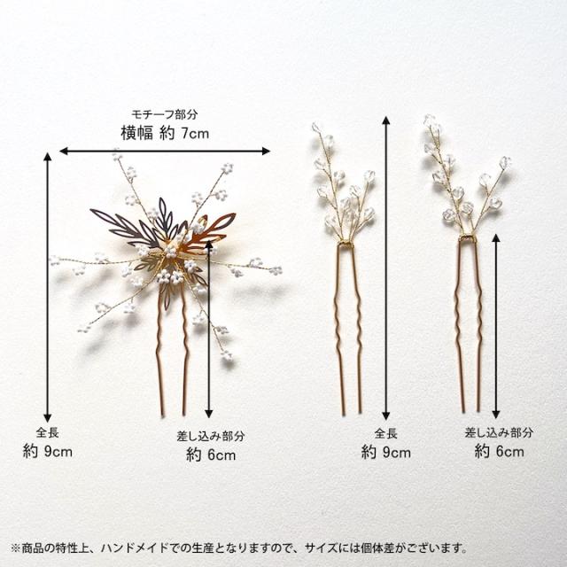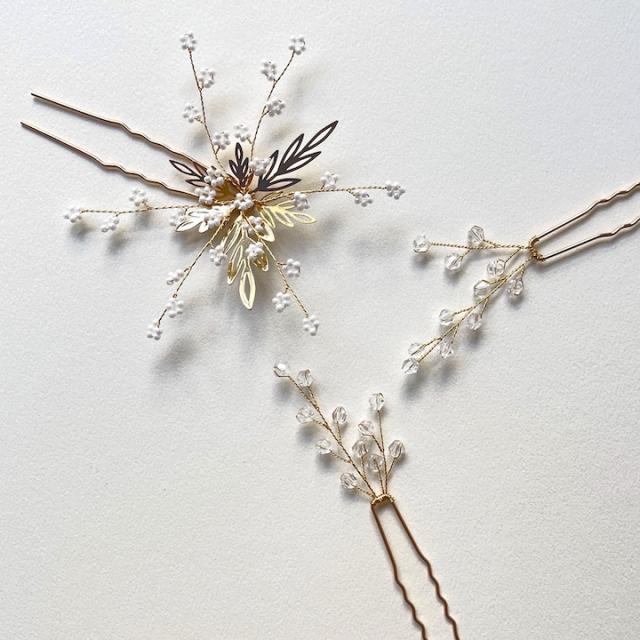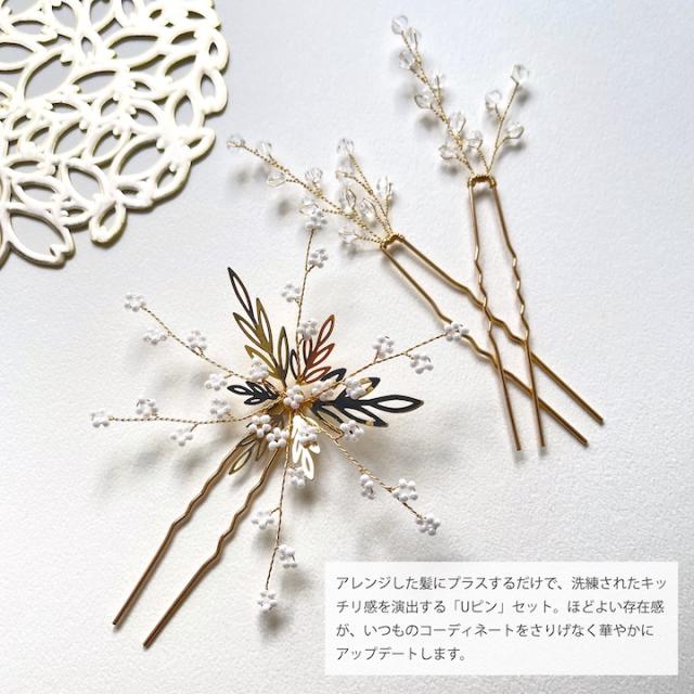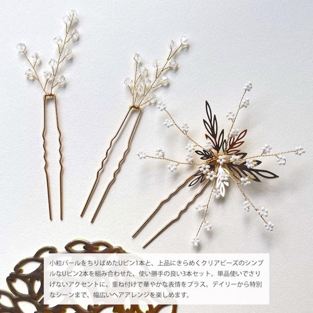 小粒パールをちりばめたUピン1本と、上品にきらめくクリアビーズのシンプルなUピン2本を組み合わせた、使い勝手の良い3本セット。単品使いでさりげないアクセントに、重ね付けで華やかな表情をプラス。デイリーから特別なシーンまで、幅広いヘアアレンジを楽しめます。