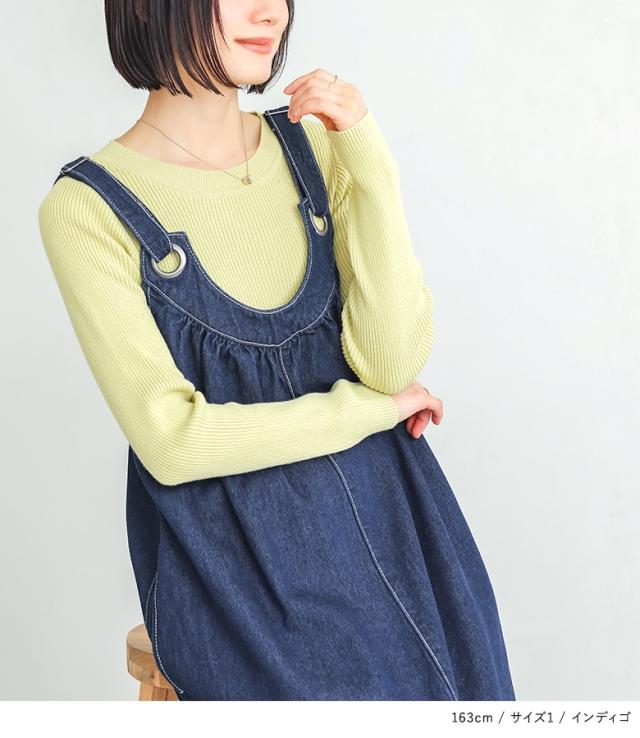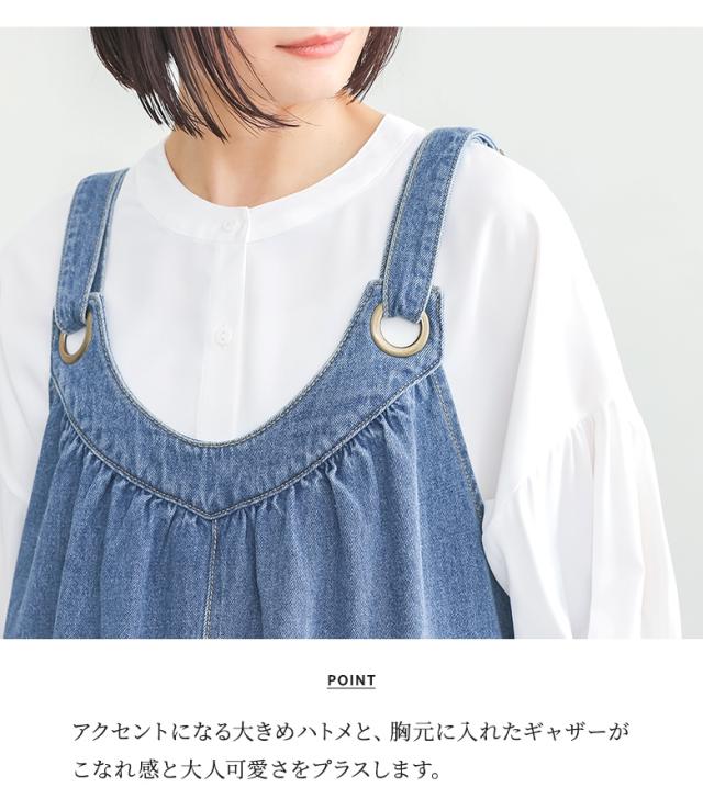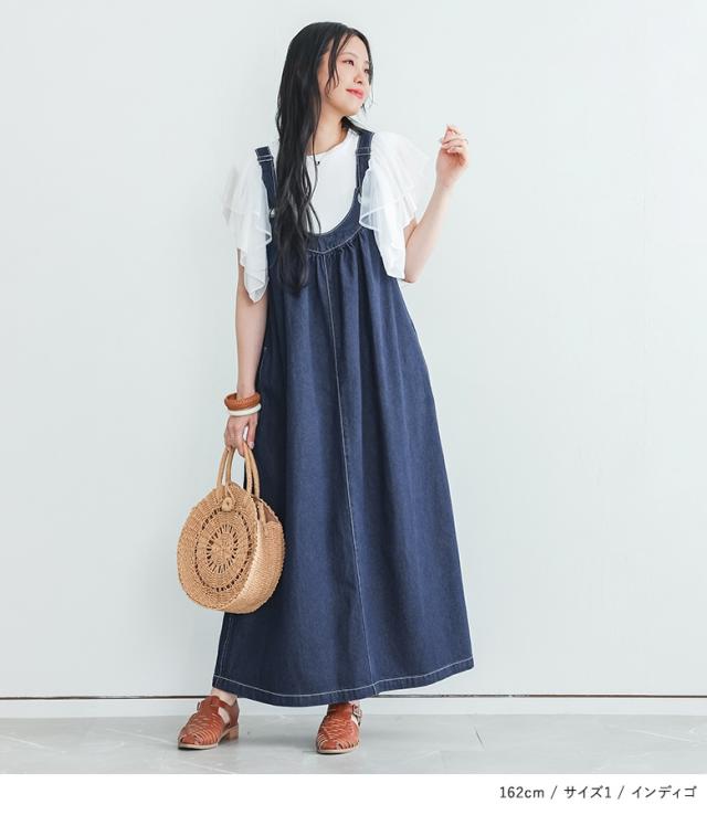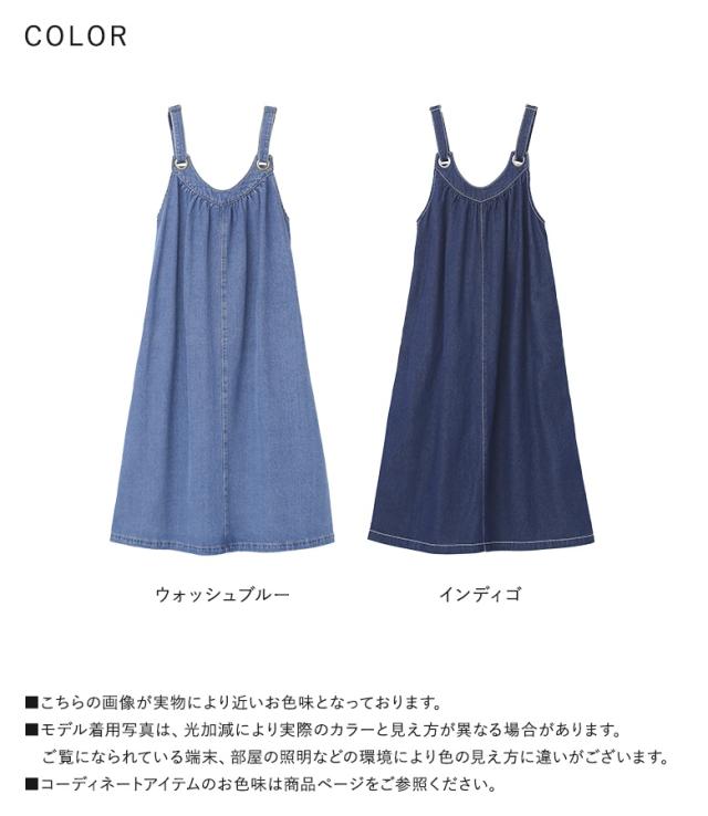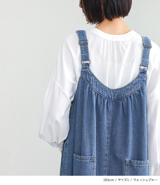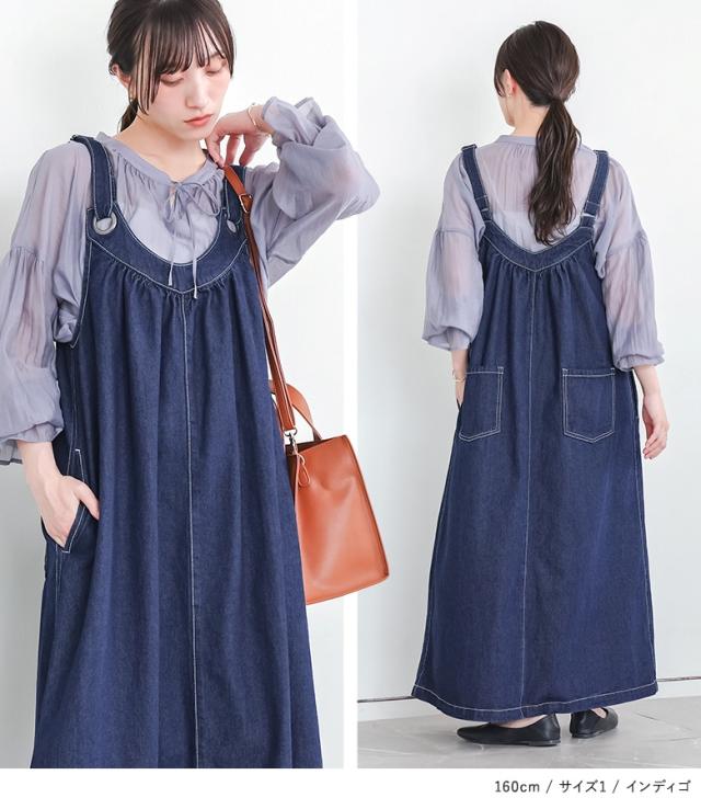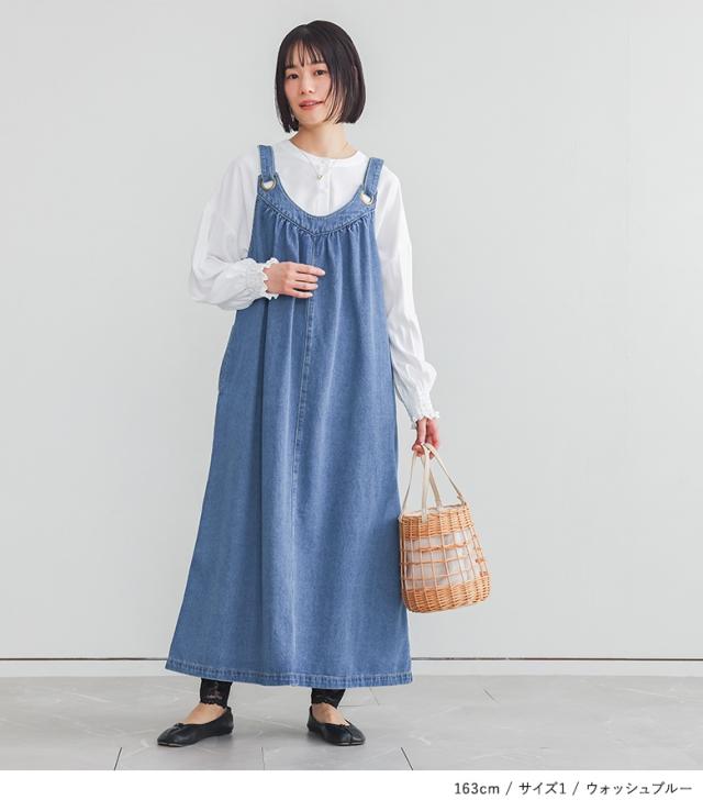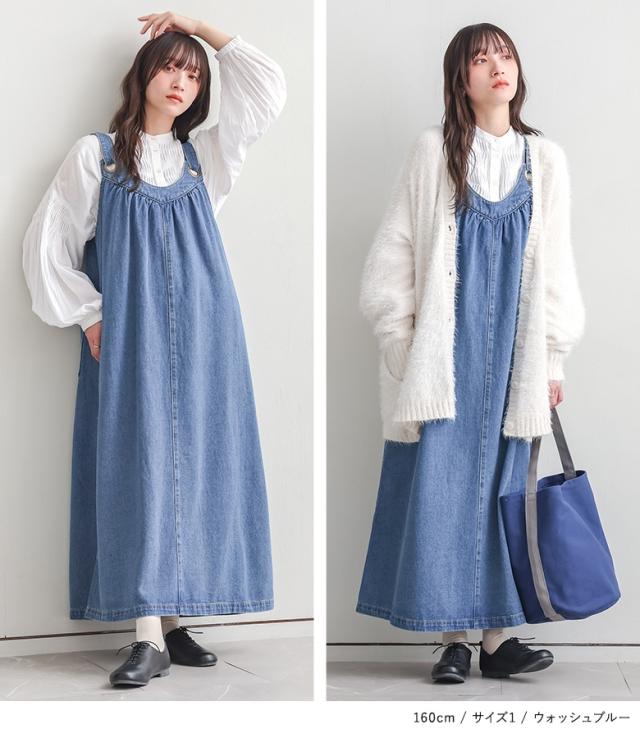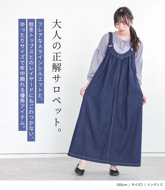 <冬新作>『デニムジャンパースカート』【メール便不可】【20】[ジャンパースカート ロング レディース ワンピース デニム フレアスカート コットン100% 調整可能 ギャザー 体型カバー オールシーズン]