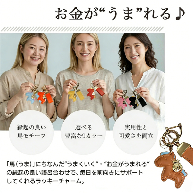 | 特徴 | 毎日使うものだから、デザインにも意味を。 「うまくいく」「お金が“うまれる”」の縁起を込めた、 馬モチーフの大人可愛いキーリングです。 【ポイント1】コーデを選ばない万能デザイン 派手すぎず地味すぎない、上品で可愛らしい馬モチーフ。 バッグや鍵に付けるだけで、毎日の持ち物にさりげないアクセントをプラスします。 【ポイント2】細部までこだわった馬モチーフ 立体感のあるフォルムと丁寧な仕上がりで、 可愛さの中にも大人っぽさを感じられるデザインです。 【ポイント3】幸運を願うラッキーチャーム付き 馬蹄モチーフのチャームをプラス。 身に付けるだけで、金運・幸運をそっとサポートします。 【ポイント4】上質で丈夫なレザー素材 手になじみやすく、毎日使っても安心の耐久性。 丁寧な縫製で、長く愛用していただけます。 【ポイント5】ギフトにも喜ばれるアイテム 豊富なカラーバリエーションで、好みに合わせて選べます。 誕生日・記念日・ちょっとした贈り物にもおすすめです。 鍵・バッグ・ポーチ・自転車など、 さまざまなシーンで活躍するキーリング。 毎日を前向きにしてくれる、お守りのような存在です。 |