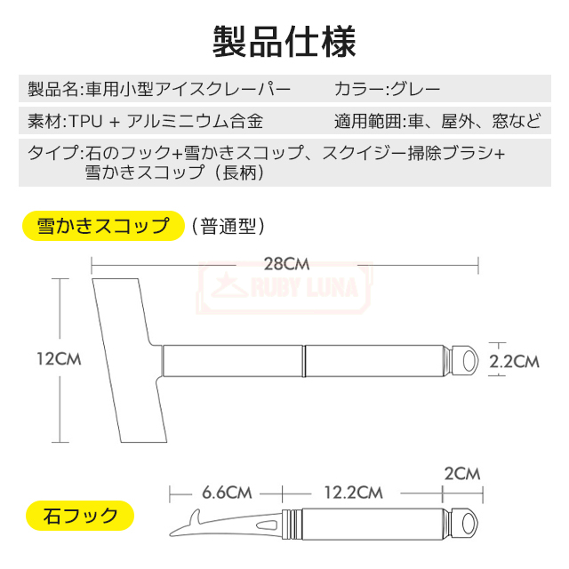 | タイプ | ◆石フック+雪かきスコップ(普通型) ◆スクイジー掃除ブラシ+雪かきスコップ(長柄) |
