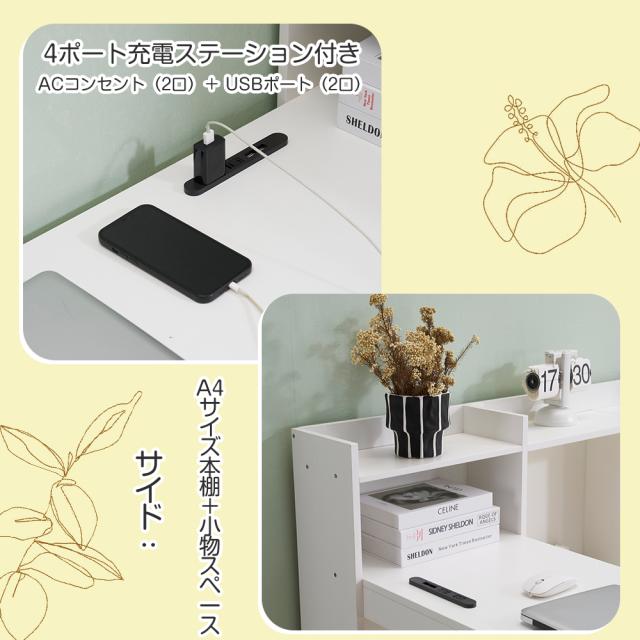【仕事もゲームも快適】幅40cm大型デスク&コンセント付き 作業効率UPデスク。 PC作業もゲームもコード煩わしさゼロ。4ポート充電ステーション付き:ACヨンセント+USBポート A4サイズ本棚+小物スペースサイド