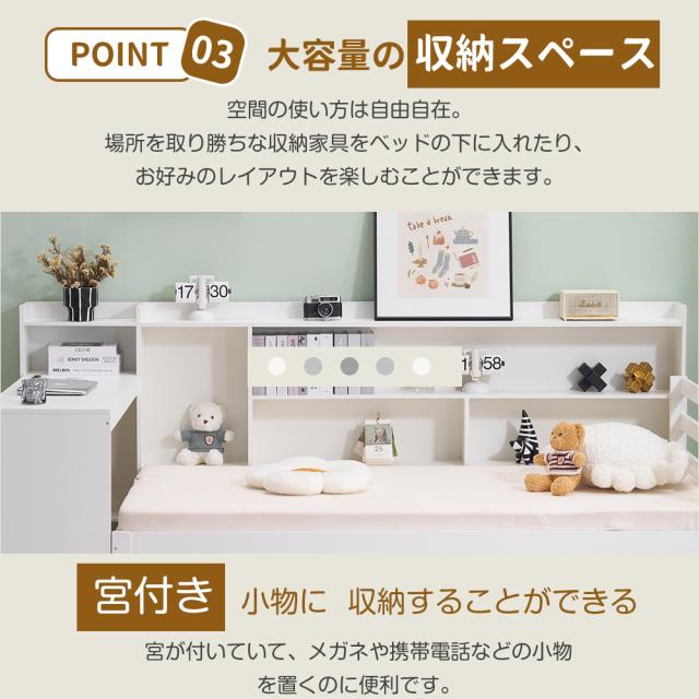 【勉強便利】これ一台で、デスクはベッドに近いので、勉強にも休憩にも便利ですし、省スペース【ベッド、デスク、ラックをコンパクトにまとめたシステムベッド】1 シンプルデザイン 2 質のよい材料 3大容量の収納スペース 頑丈設計 5 宮付き 小物収納 6 通気性良い