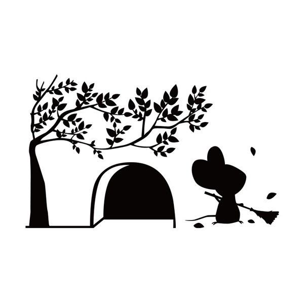 枝を広げた木の下で、小さな動物がほうきを持って落ち葉を集める、