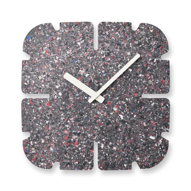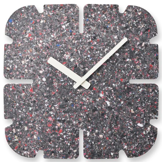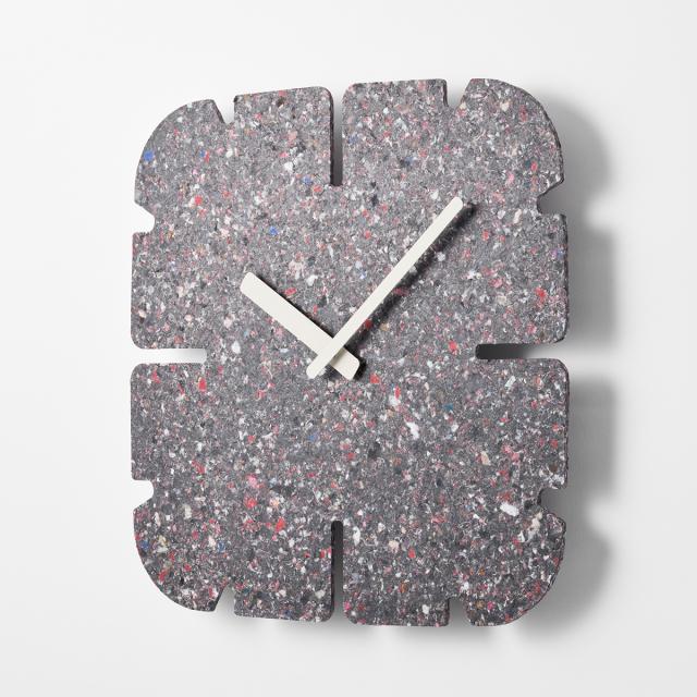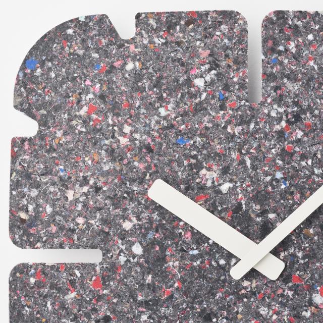 廃棄衣料品で作られる板は全てに微妙な色や模様の違いがあり、同じものが2つとなくその違いを楽しめることも特徴の一つです。また、使われなくなった時計は回収し、再びマテリアルに戻り、新たな時計として生まれ変わります。紙や木材の型抜きを行うトムソン加工で切り抜き、素材の表情をそのまま生かしたミニマルなデザインのこの時計は空間に馴染むアートピースであり、静かに時の経過を知らせるプロダクトでもあります。