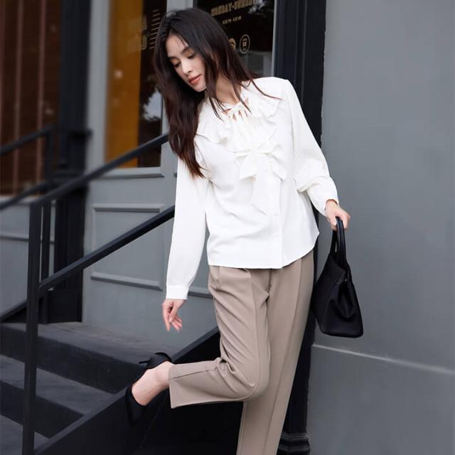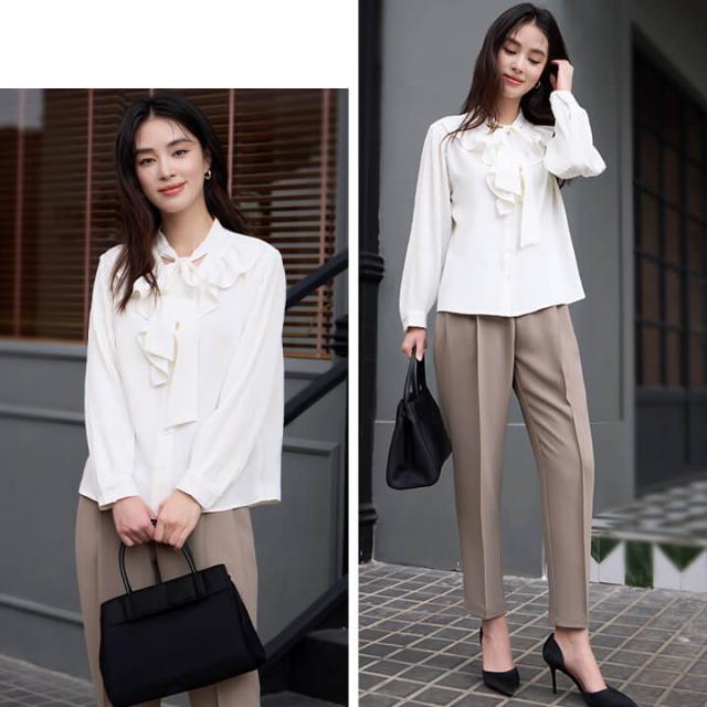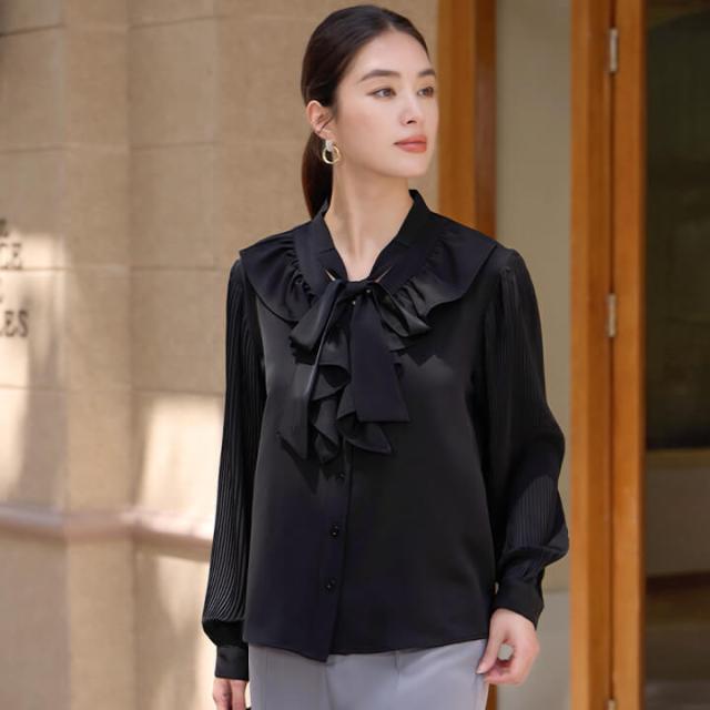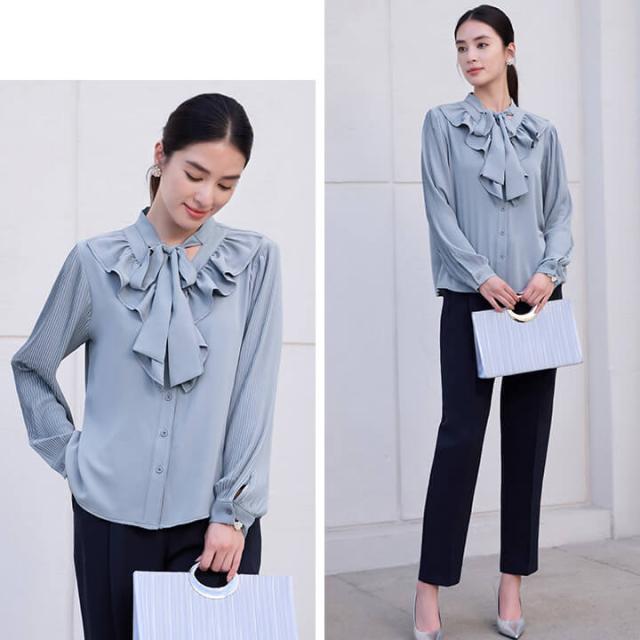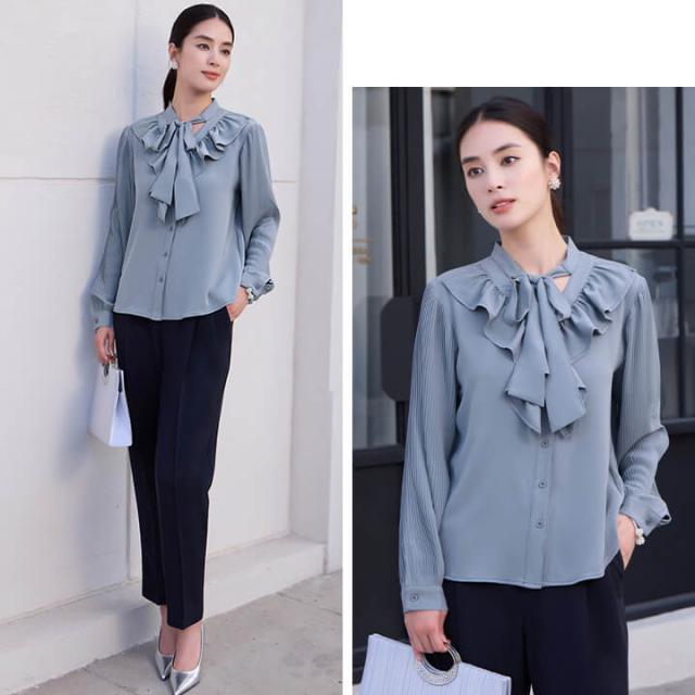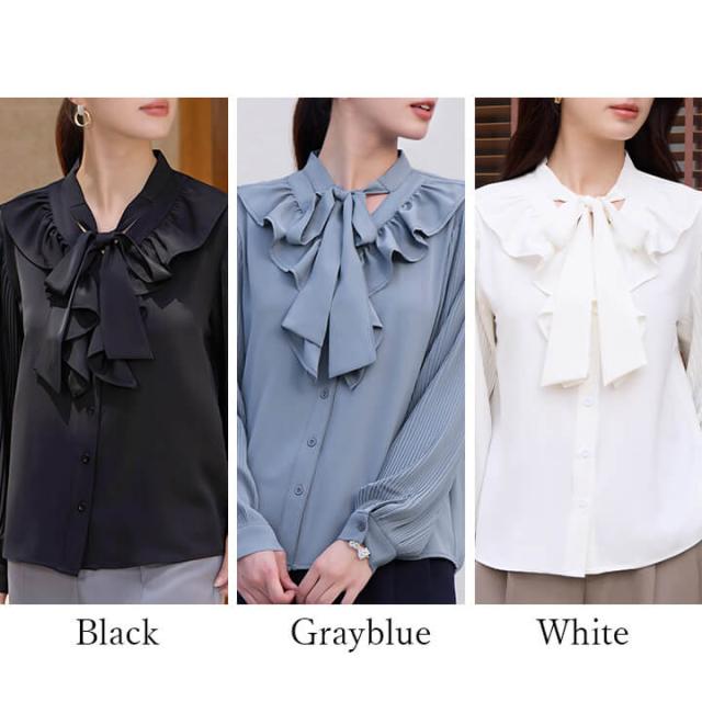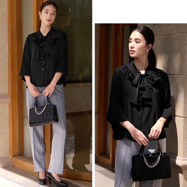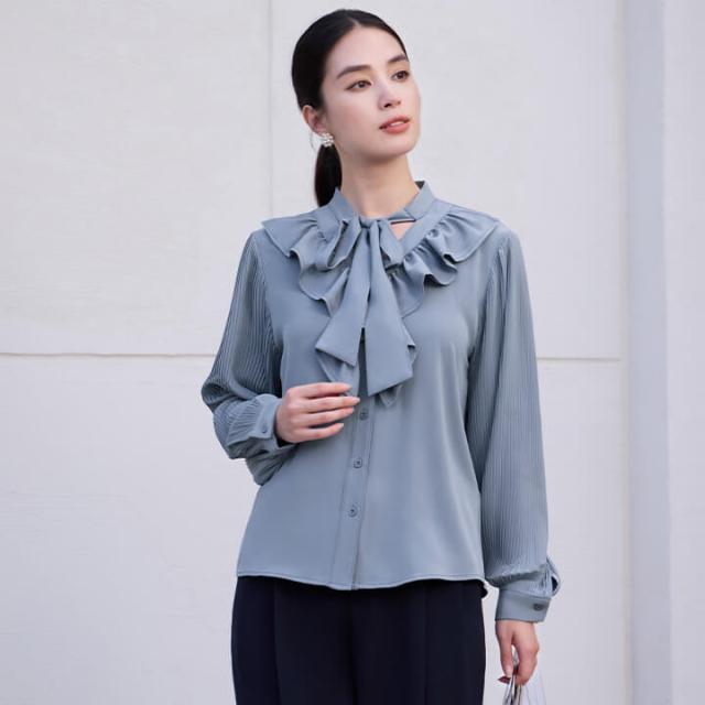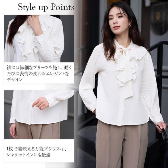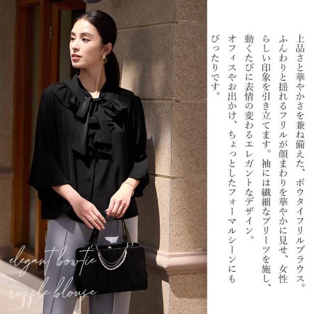 上品さと華やかさを兼ね備えた、ボウタイフリルブラウス。