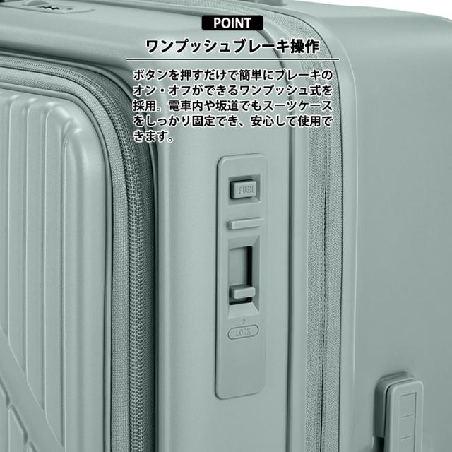 本体側面の操作レバーで簡単にオン/オフ切替ができるストッパー機能付きで、電車内や坂道などでスーツケースの不用意な転がりを防ぎます。