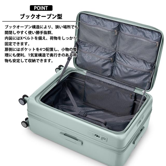 中〜長期旅行向けサイズには、省スペースでも使いやすいブックオープンタイプを採用し、ホテルのベッドや限られたスペースでも荷物の出し入れがしやすい構造です。
