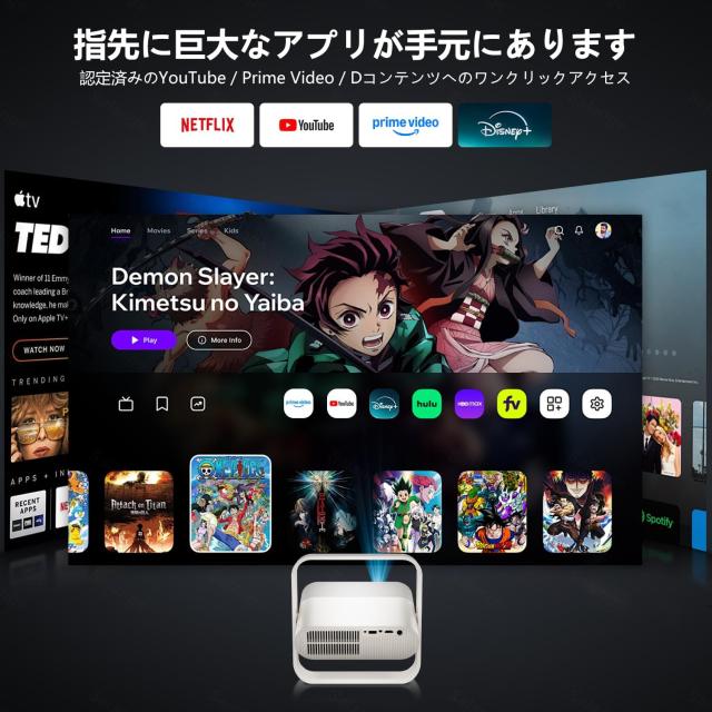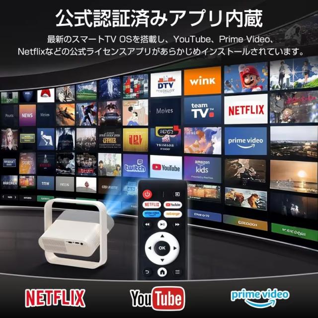 ジェクターは、独自のスマートOSシステムを搭載し、認証済むのNetflix、YouTube、Prime Videoなどの人気動画アプリを内蔵しています。TV Stickや外部デバイスを接続する必要は一切なく、すぐにお気に入りの映画や動画を大画面で楽しむことができます。他の非認証プロジェクターと違い、面倒な設定や接続の手間がなく、アプリが突然使えなくなる心配もありません。Netflixで最新の映画を観ながら、家で映画館のような体験を、Prime Videoで海外ドラマを一気見する楽しさも、JUUEプロジェクターなら手軽に実現できます。