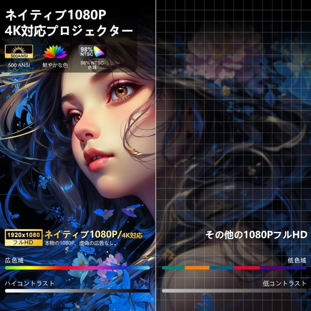 このプロジェクターは、1500ANSIルーメンの高輝度、ネイティブ1080P解像度、4K対応により、昼間の明るい部屋でも鮮明でクリアな画面を提供し、まるで映画館のような迫力の映像体験をお楽しみいただけます。さらに、HDR 10+技術を搭載し、98%のNTSC色域に対応することで、色鮮やかで深みのある映像を再現。実際に目で見る映像が、まるで目の前に広がるようなリアルさを感じさせます。また、目に優しい拡光技術が採用されており、長時間の視聴でも目の疲れを感じにくく、子どもから高齢者まで誰でも安心して使える設計です。家族みんなで快適に映画やゲームを楽しめる、まさに理想的な家庭用プロジェクターです。