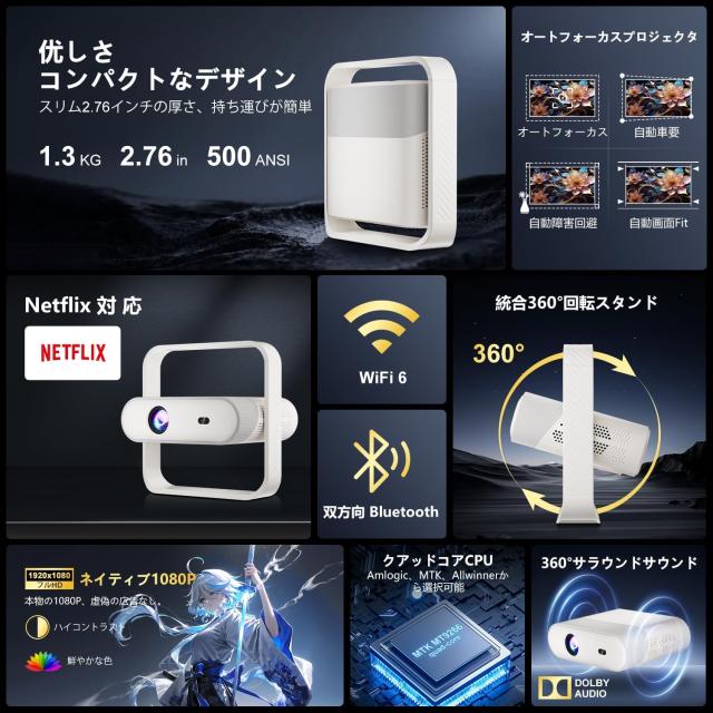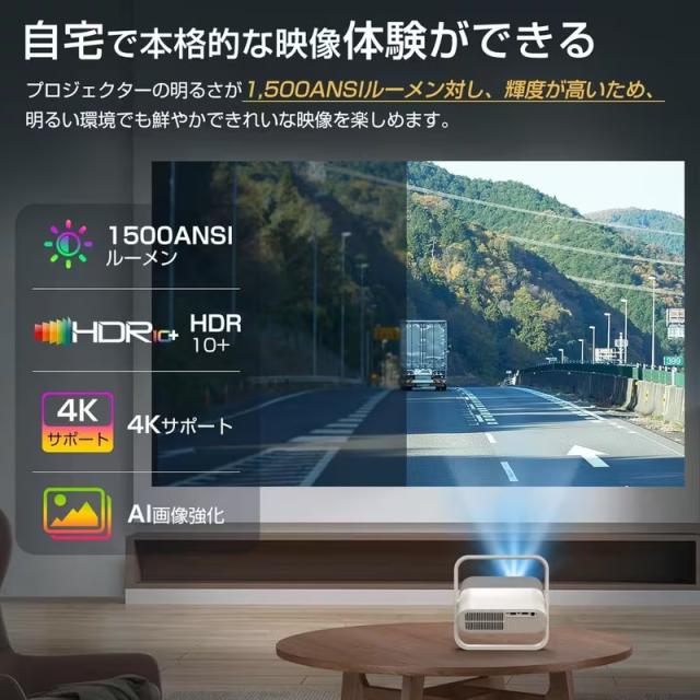 プロジェクター 家庭用 天井投影対応 1500ANSI projector 4K HDR10+ Dolby Vision 自動台形補正 オートフォーカス WiFi6 Bluetooth5.4 Netflix YouTube公式対応 高音質20Wスピーカー内蔵