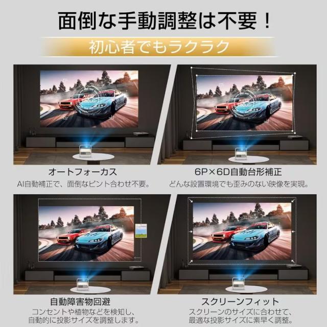 このプロジェクターは、AI技術を活用したオートフォーカス機能を搭載し、設置後すぐに最適な焦点に自動で調整。手動で焦点を合わせる手間がなく、すぐに鮮明な映像を楽しめます。さらに、6D×6P自動台形補正機能により、角度や設置場所に関係なく、画面の歪みを自動で補正し、常に完璧な長方形の映像を表示します。加えて、障害物回避機能を搭載しており、周囲の物を自動で検出し、画面サイズを最適に調整。スクリーンのサイズに合わせて自動調整が行われ、誰でも簡単に理想的な映像を楽しめます。操作は直感的で、初心者でも安心して使用できる設計です。