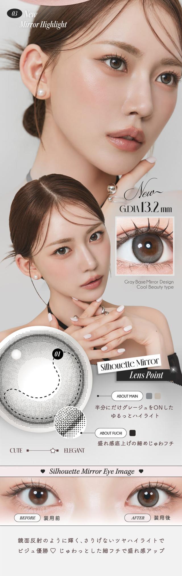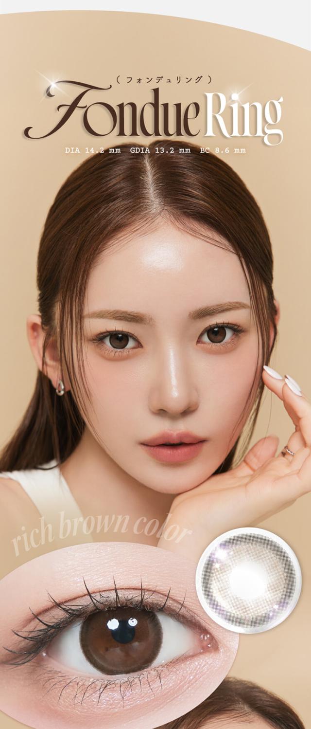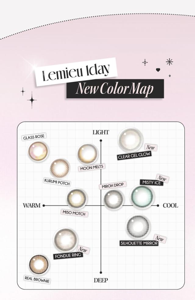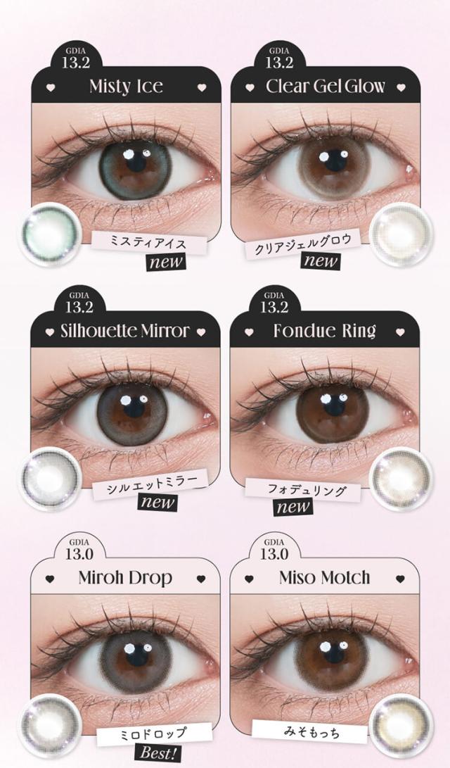 ■クリアジェルグロウ(Clear Gel glow) 【レンズ直径14.2mm】【着色直径13.2mm】 薄めのほわグレーフチでちゅるんと透明感♡ 光のしずくみたいなツヤ感が可愛い、クリアトーンが印象的 光をぎゅっと閉じ込めたような立体ハイライトで透明感UP! ■ミスティアイス(Misty Ice) 【レンズ直径14.2mm】【着色直径13.2mm】 めずらしいブルー&グリーンのダブルハイライト♡ 黒髪にも茶髪にも合う神秘的な女神カラーが誕生! イマドキハイライトとしっかりフチでアイドル顔に! ■シルエットミラー(Silhouette Mirror) 【レンズ直径14.2mm】【着色直径13.2mm】 鏡面反射が美しいナチュラルなハイライトカラー♡ 鏡面反射のように輝く、さりげないツヤハイライトで ビジュ優勝♡ じゅわっとした細フチで盛れ感アップ! ■フォンデュリング(Fondue Ring) 【レンズ直径14.2mm】【着色直径13.2mm】 独特なマーブルドットとリッチな濃厚ブラウンフチでツヤ感を強調! ビジュつよ♡甘いブラウンで可愛いく目ヂカラUP! ナチュラルだけど、一瞬でビジュつよ♡ちゅるんとしたツヤ感で綺麗めにも甘めにも使える! ■リアルブラウニー(REAL BROWNIE) 【着色直径13.2mm】 しっとり質感、ほろ甘ブラウン♡ 濃厚ブラウンに浮かびあがるゆるっと煌めく永遠の環。スウィートで大人盛れ確定! ■くるみぽっち(KURUMI POTCH) 【着色直径13.2mm】 ちゅるんって可愛くて、ずるい♡ 透度高めのくるみ色に、チェリー(韓国語でぽっち)みたいに丸くて甘い質感。ゆるっとトーンUP! ■ムーンメルツ(MOON MELTS) 【着色直径13.0mm】 ほんのり輝く儚い月が浮かぶ♡ ゆるゆると月が溶けだすとろ甘なフォルムにきゅん。今注目の儚げ系レンズ! ■グラスローズ(GLASS ROSE) 【着色直径13.2mm】 ひとつの色には縛られない♡ うるツヤ感とロマンティックが溢れるステンドグラスみたいな色模様!ときめくピンクブラウン。 ■みそもっち(MISO MOTCH) 【着色直径13.0mm】 自然に素敵な笑顔になれる♡ 韓国語で「みそ」は笑顔、「もっち」は素敵という意味。飾りすぎないのが今の気分! ■ミロドロップ(MIROH DROP) 【着色直径13.0mm】 迷路みたいに深いダークグレー♡ 黒じゃない曖昧なグレーカラーは一度ハマったら抜け出せない。ミロ=韓国語で迷路。 |