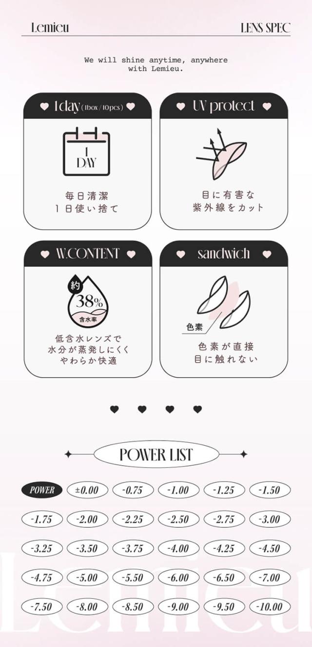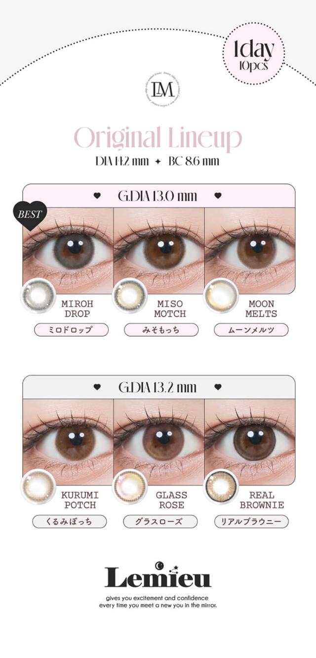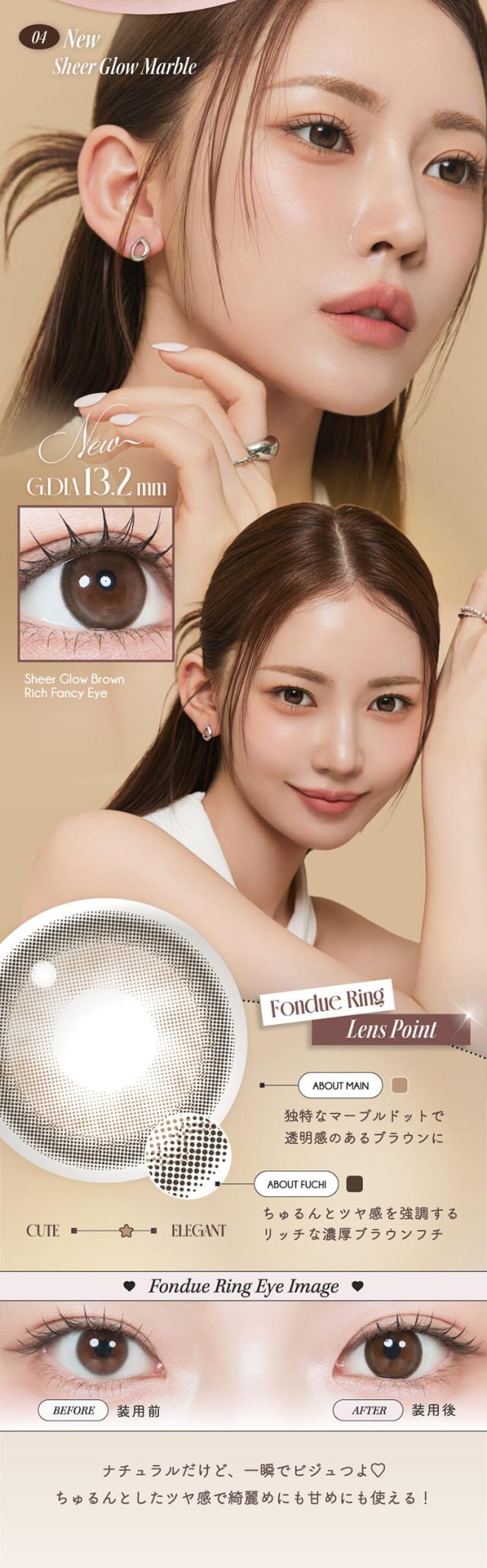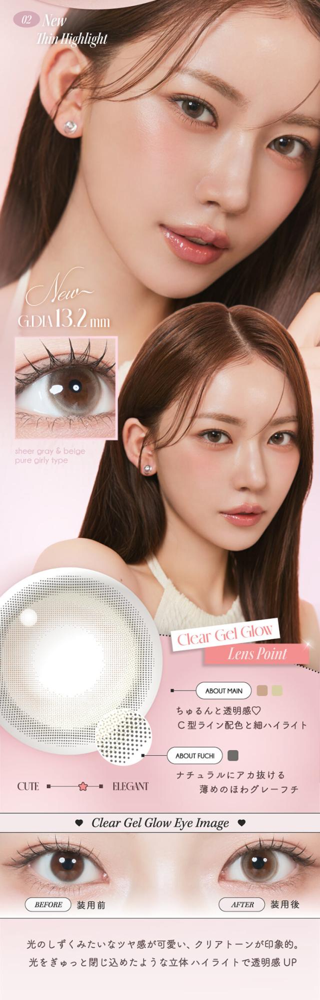 ■クリアジェルグロウ(Clear Gel glow) 【レンズ直径14.2mm】【着色直径13.2mm】 薄めのほわグレーフチでちゅるんと透明感♡ 光のしずくみたいなツヤ感が可愛い、クリアトーンが印象的 光をぎゅっと閉じ込めたような立体ハイライトで透明感UP! ■ミスティアイス(Misty Ice) 【レンズ直径14.2mm】【着色直径13.2mm】 めずらしいブルー&グリーンのダブルハイライト♡ 黒髪にも茶髪にも合う神秘的な女神カラーが誕生! イマドキハイライトとしっかりフチでアイドル顔に! ■シルエットミラー(Silhouette Mirror) 【レンズ直径14.2mm】【着色直径13.2mm】 鏡面反射が美しいナチュラルなハイライトカラー♡ 鏡面反射のように輝く、さりげないツヤハイライトで ビジュ優勝♡ じゅわっとした細フチで盛れ感アップ! ■フォンデュリング(Fondue Ring) 【レンズ直径14.2mm】【着色直径13.2mm】 独特なマーブルドットとリッチな濃厚ブラウンフチでツヤ感を強調! ビジュつよ♡甘いブラウンで可愛いく目ヂカラUP! ナチュラルだけど、一瞬でビジュつよ♡ちゅるんとしたツヤ感で綺麗めにも甘めにも使える! ■リアルブラウニー(REAL BROWNIE) 【着色直径13.2mm】 しっとり質感、ほろ甘ブラウン♡ 濃厚ブラウンに浮かびあがるゆるっと煌めく永遠の環。スウィートで大人盛れ確定! ■くるみぽっち(KURUMI POTCH) 【着色直径13.2mm】 ちゅるんって可愛くて、ずるい♡ 透度高めのくるみ色に、チェリー(韓国語でぽっち)みたいに丸くて甘い質感。ゆるっとトーンUP! ■ムーンメルツ(MOON MELTS) 【着色直径13.0mm】 ほんのり輝く儚い月が浮かぶ♡ ゆるゆると月が溶けだすとろ甘なフォルムにきゅん。今注目の儚げ系レンズ! ■グラスローズ(GLASS ROSE) 【着色直径13.2mm】 ひとつの色には縛られない♡ うるツヤ感とロマンティックが溢れるステンドグラスみたいな色模様!ときめくピンクブラウン。 ■みそもっち(MISO MOTCH) 【着色直径13.0mm】 自然に素敵な笑顔になれる♡ 韓国語で「みそ」は笑顔、「もっち」は素敵という意味。飾りすぎないのが今の気分! ■ミロドロップ(MIROH DROP) 【着色直径13.0mm】 迷路みたいに深いダークグレー♡ 黒じゃない曖昧なグレーカラーは一度ハマったら抜け出せない。ミロ=韓国語で迷路。 |