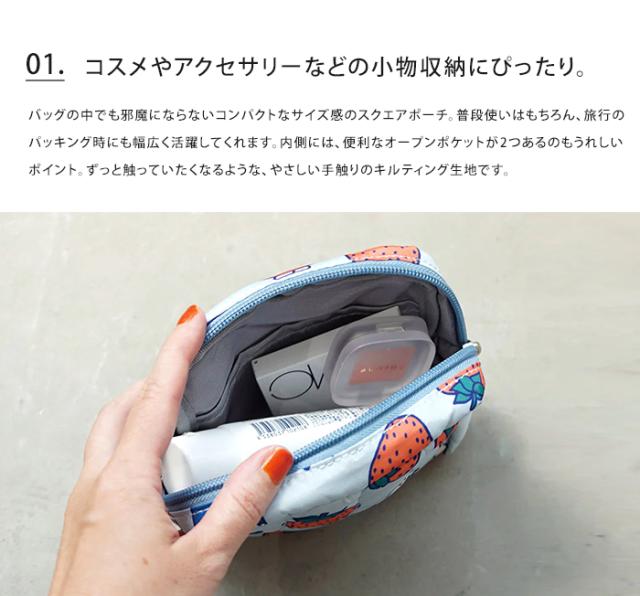 バッグの中でも邪魔にならないコンパクトなサイズ感のスクエアポーチ。普段使いはもちろん、旅行のパッキング時にも幅広く活躍してくれます。内側には、便利なオープンポケットが2つあるのもうれしいポイント。左右どちらからも開閉できるダブルファスナー付き。ずっと触っていたくなるような、やさしい手触りのキルティング生地です。