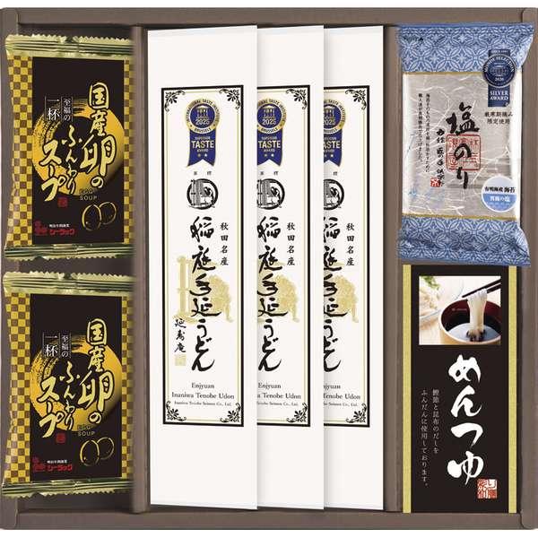 秋田名産稲庭うどんと、ふんわりたまごスープのセット品です。参百年の伝統を受け継いだ、「手延」の称号は厳選した良質の小麦を原料に手間暇かけて作られた「うどん」にのみ与えられます。2012年よりiTQi優秀味覚賞を連続で受賞、2024年に品質競技会賞金賞を受賞しました。また塩海苔はモンドセレクション銀賞を受賞いたしました。