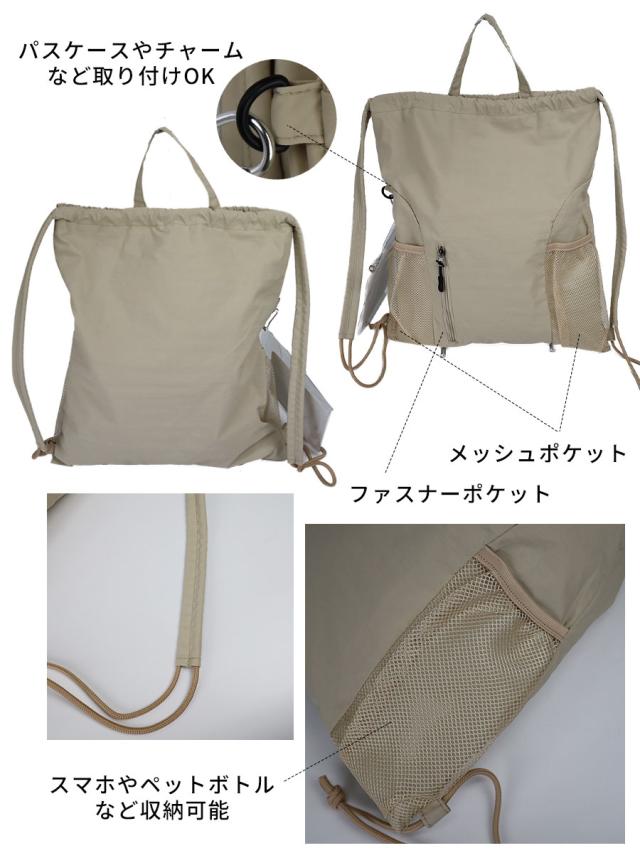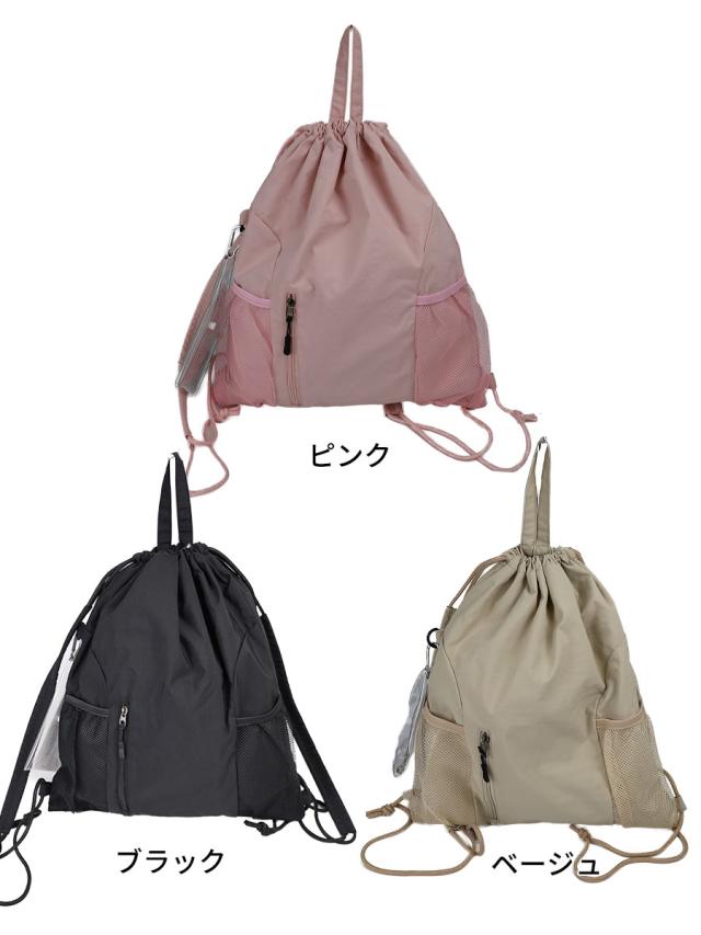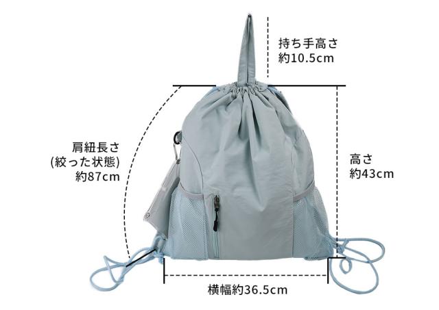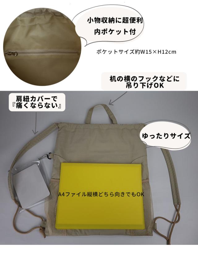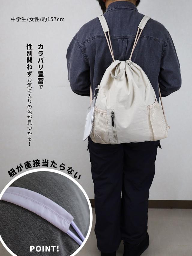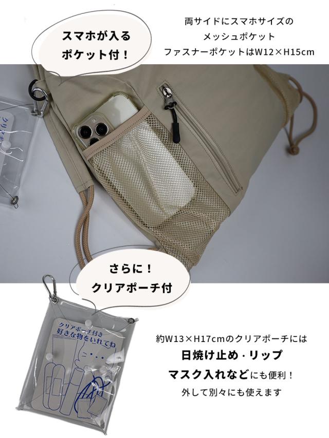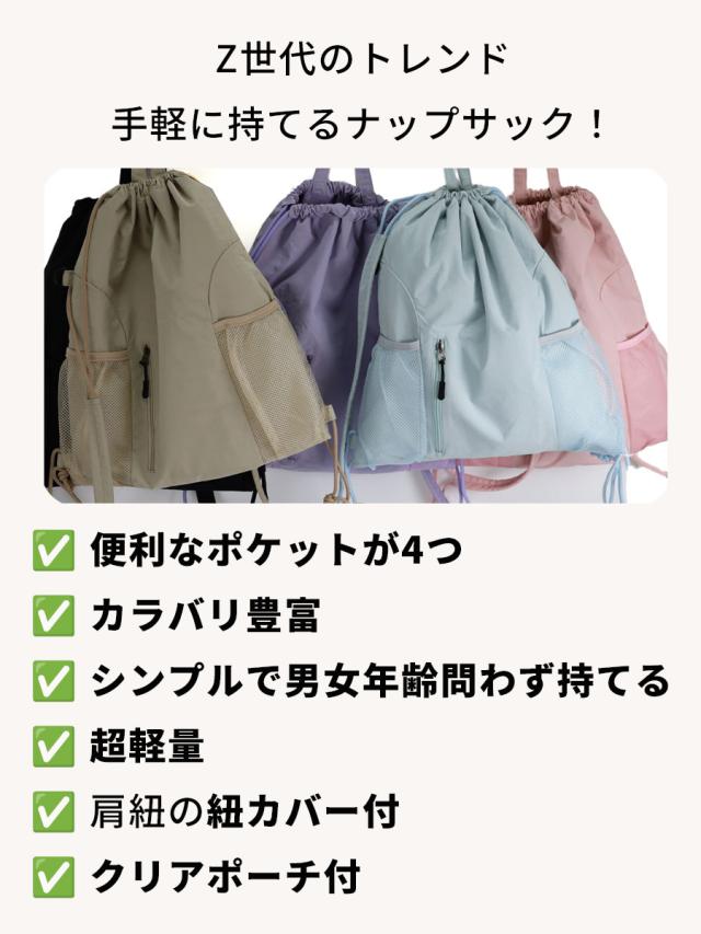 ■Z世代のトレンドとなっているナップサック。休日のちょっとした外出、スクールバッグに入りきらない荷物のサブバッグた体操服入れにして学校になど、軽量でA4ファイル大のころ合いのサイズ感で手軽に持てると大人気。大人も温泉やプールや体操などの習い事やウオーキングなど幅広くお使いいただけます。 ■1番のおすすめポイントは4つあるポケット。両サイドにあるメッシュポケットにはペットボトルやスマホなどが、前面と内部にあるファスナーポケットには鍵などの小物を収納できます。 ■肩紐にはカバーが付いており肩に食い込まずお使いいただけます。マスクや日焼け止めなどの小物を入れられるクリアポーチが付いています。カラビナで取り付けるタイプなので外して別々にお使いいただけます。 |