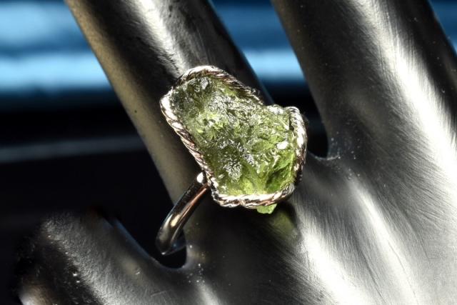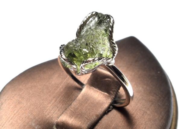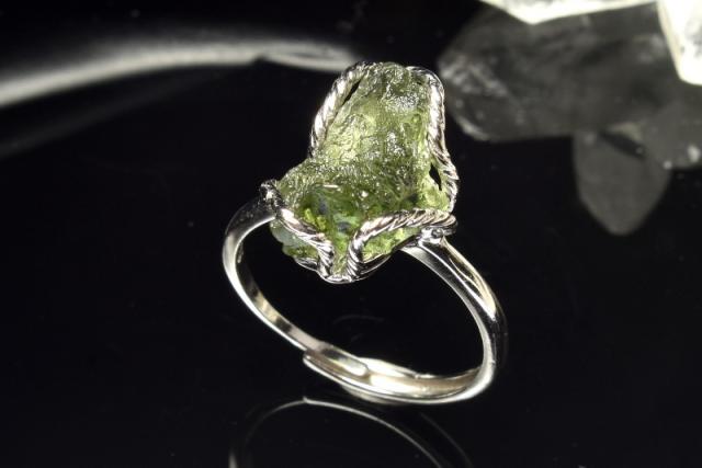 【1点物】シルバー925◇入手困難 モルダバイト 16x9mm 原石 指輪リング(サイズ調整可) 金運・仕事運【ネコポス送料無料】_PC8736