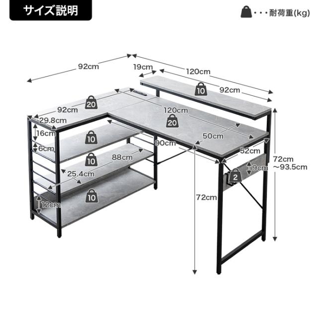 【耐荷重】天板:約20kg、モニター台:約10kg、ラック天板:約20kg