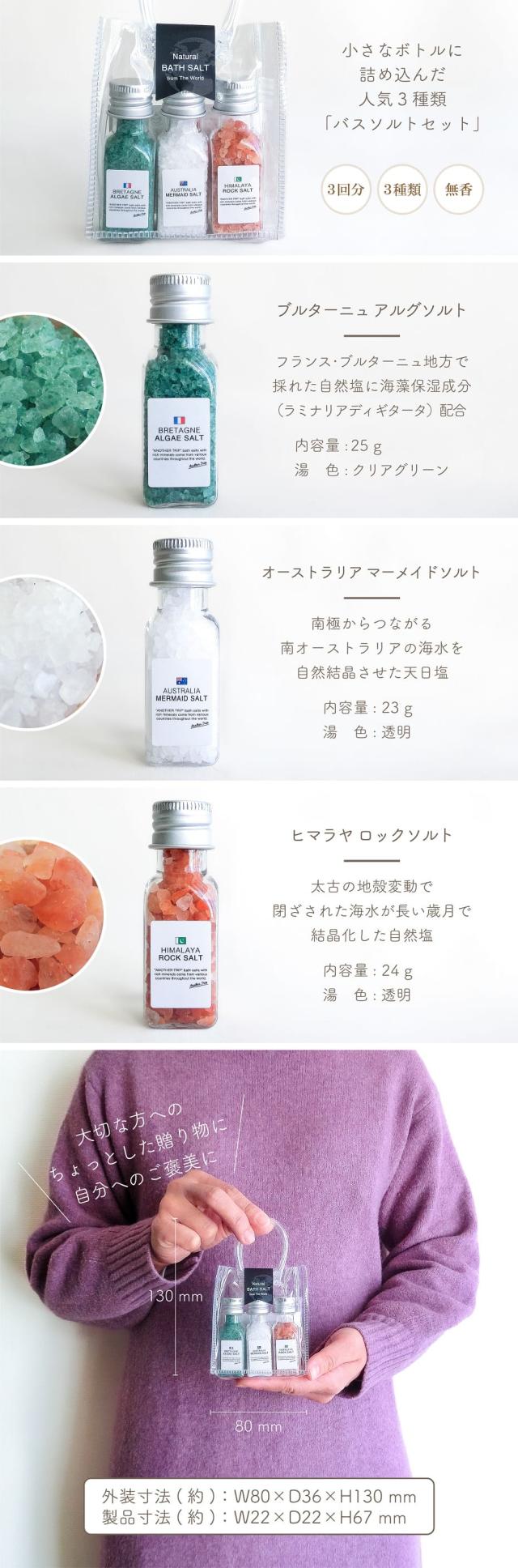 | 内 容 | バスソルト×3本 (種類によって内容量は異なる) |