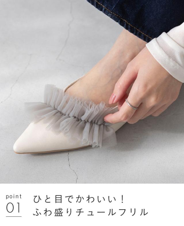トレンド継続中のシアーチュールのフリル×シャープなラインで足元すっきり見せのポインテッドトゥで甘さと大人っぽさが詰まった贅沢な1足。