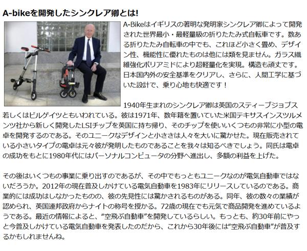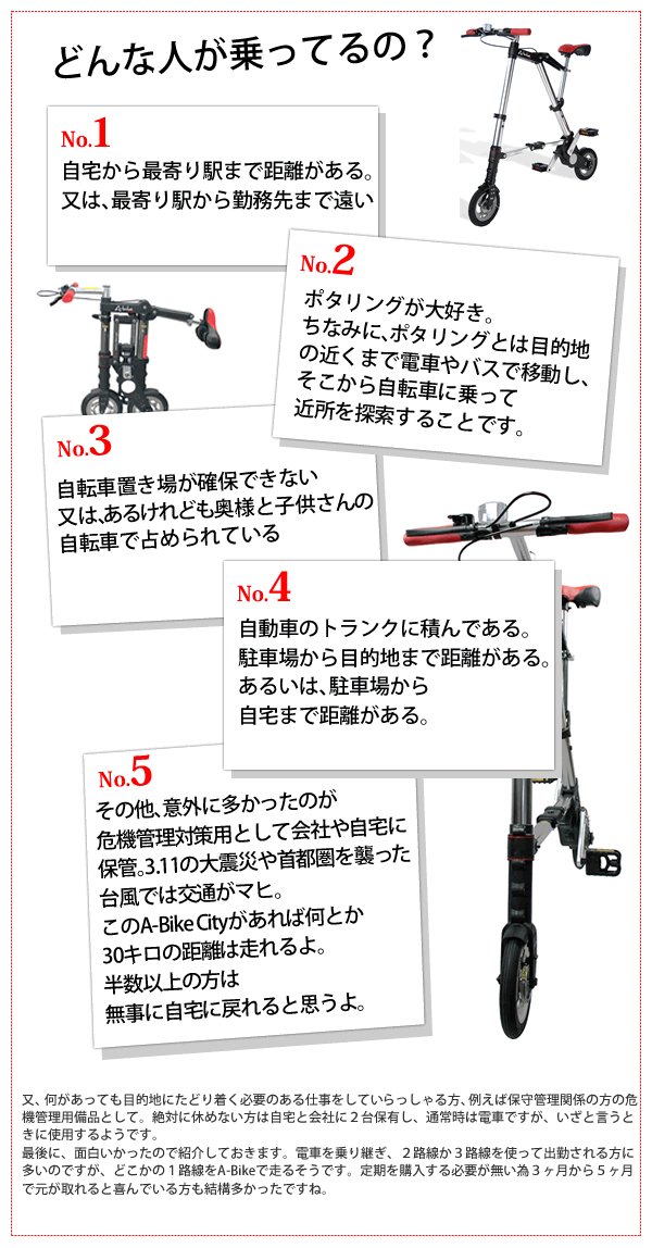 A-bikeの購入をご検討されている方へ A-bikeは小型化・軽量化を図るため 一般の自転車とは全く異なった構造となっております。 そのため、出荷の際、ミリ単位での細かい調整や整備が出来て 初めて快適に乗ることが可能となるバイクです。 この初期整備を行わずに乗りますと、快適に乗れないばかりではなく 整備不良による思わぬおおきな事故に繋がることもございます。 A-bikeをご購入される場合は、保証の有無や出荷整備の完成精度などを よくお確かめの上、ご購入されることを強くお勧めいたします。 |