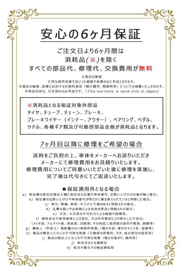 | A-Bikeの発送について | 当店のA-Bikeは、構造を知り尽くした専任スタッフが完璧に整備をして 、すぐに乗れる状態でメーカーよりお送りさせて頂いております。 保証期間(6ヶ月)を過ぎた後のアフターサービスもパーツを含め、常に万全の体制を敷いております。 |