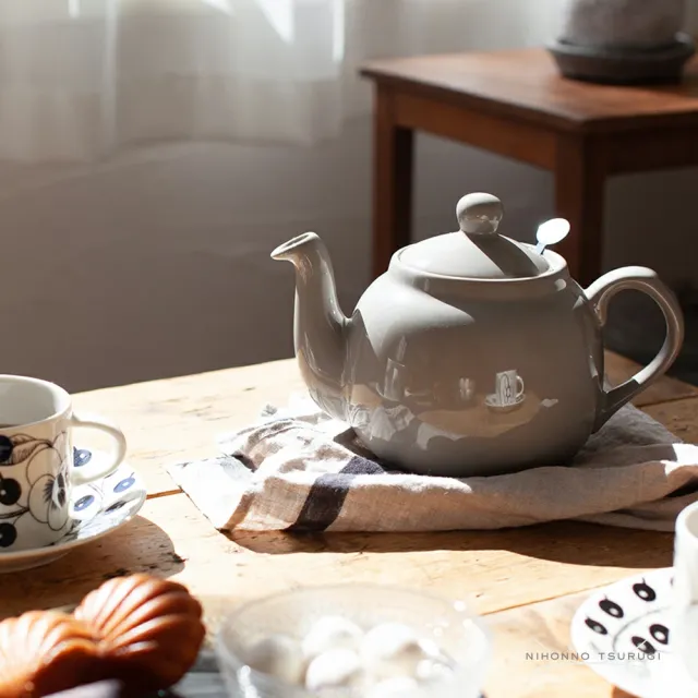 まるっこい形と機能性の高さで、紅茶の国イギリスの家庭で長く愛されているティーポット。ころんとしたフォルムで可愛らしくナチュラルなデザインが魅力です。ポットの中にはステンレス製の目の細かいティーストレーナーが付いていて、茶葉が穴に挟まりづらくなっています。また、ポットの蓋にある凹みと、ストレイナーの持ち手の付け根が引っかかる仕組みになっているため、傾けても蓋がはずれにくいのも特徴です。 別売りのティーコジーを被せると、保温力のカバーにもなり、何より見た目の可愛らしさに心をくすぐられます。