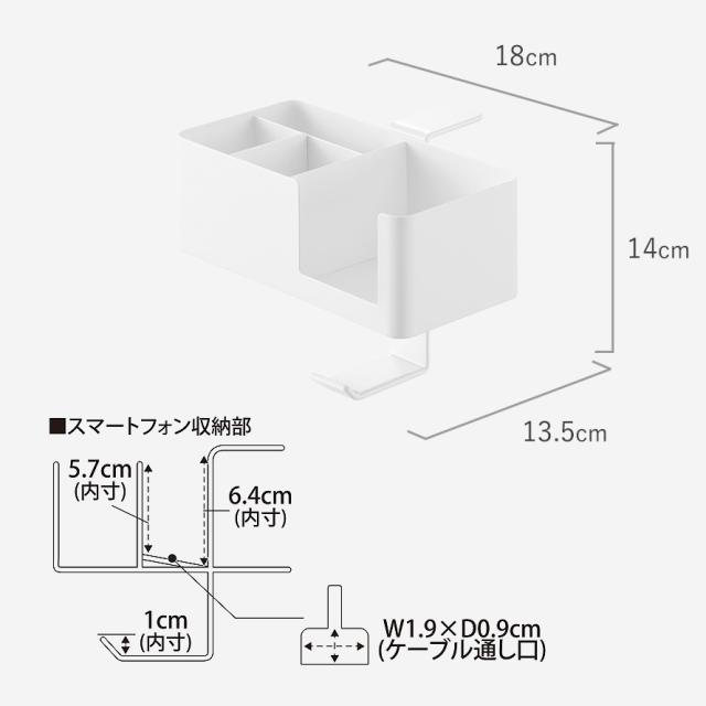 ■内寸サイズ:コップ収納部/幅8.8×奥行8.7×高さ6cm スマートフォン収納部/幅8.7×奥行2.9×高さ5.7〜6.4cm ケーブル通し口/幅1.9×奥行0.9cm 小物収納部/幅8.7×奥行5.6×高さ6.1cm 仕切り/高さ5.8cm フック部/幅2.8×奥行5.3×高さ1cm
