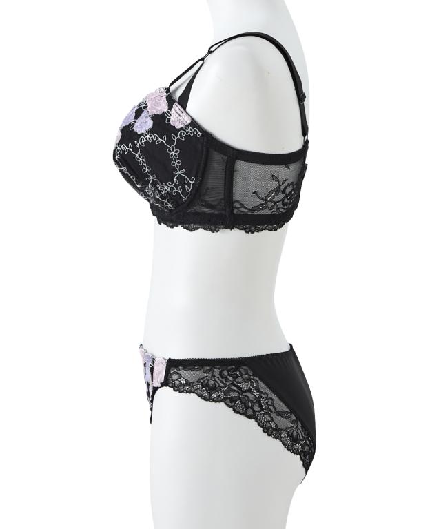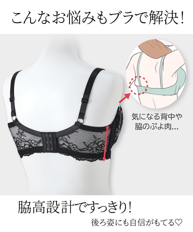 エレガントなブラ&ショーツが登場! ローズ刺繍が目を引くデザイン! 胸元のチャームでゴージャスさをプラス 脇高設計で背中からしっかり寄せこみ、美谷間&美シルエット! 幅の広い脇高設計でサイドのはみ肉をしっかりキャッチして、バストの横流れを防止してくれる脇高ブラジャー。 ブラの着用で気になる背中の段差を、脇から背中までカバーしてフラットに整えます。
