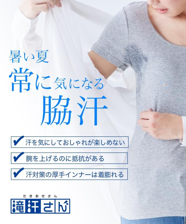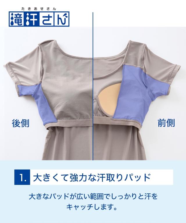 特大汗取り付きインナーシリーズ「滝汗さん」の機能をそのまま、 さらに着心地UP! ポイント1 暑い季節にもさらりと着用できるよう身生地を見直し! ポイント2 汗取りパッドから肩部分のパターンを見直すことで脇へのフィット感UP! 夏の汗染み対策に、「滝汗さん」是非お試しください。 気になる汗染みに即戦力! もう汗を気にしたくない方に向けた特大汗取りパッド付インナー「滝汗さん」 ・夏に汗染みが目立つグレーや色物の服が着られない… ・他人の目が気になって仕方がない… ・電車やバスのつり革や人前に出るシーンなど、腕をあげられない… ・汗染みのことばかり考えて常に緊張状態… そんな脇汗の悩みに終止符を! 「滝汗さん」 累計68万枚を突破した特大汗取りパッド付インナーシリーズ。 脇全体を覆うように設計された特大汗取りパットで汗を逃さずキャッチ! 汗を逃さないその秘密は、特殊な加工をを施した二重構造の汗取りパッド。 肌にあたる部分は汗をさっと吸う綿混素材を、 その裏に撥水加工をすることで汗染みが染み出すのを防ぎます。 身生地は薄手の吸汗速乾素材。 汗をかいても素早く吸収しサッと乾くので快適。 なめらかな肌触りとストレッチ性のある生地で気持ち