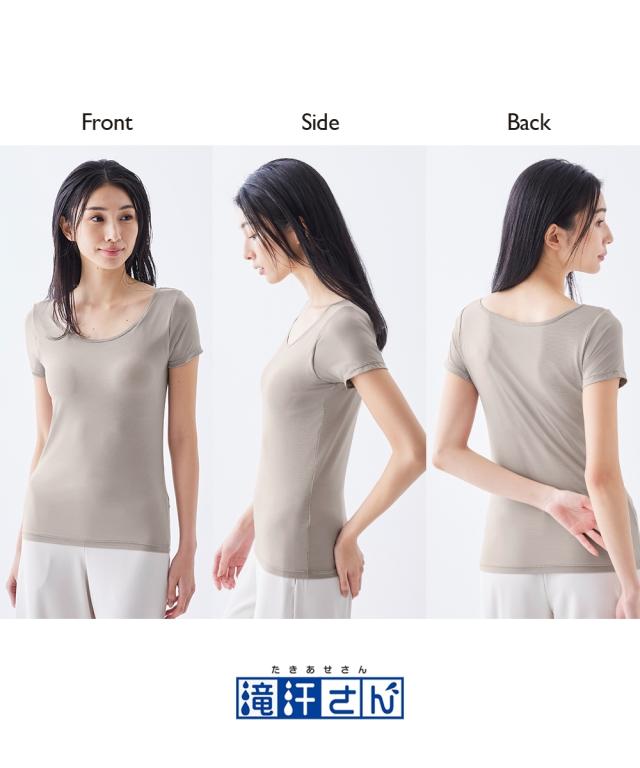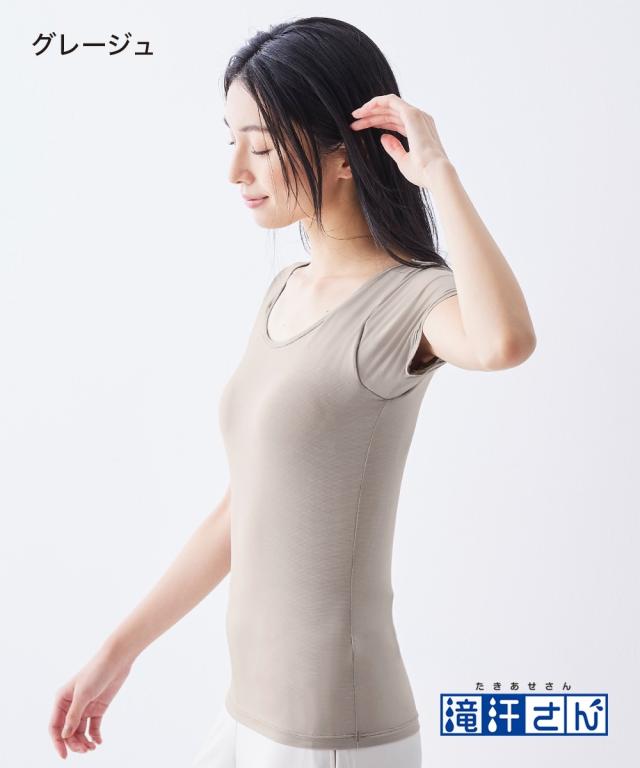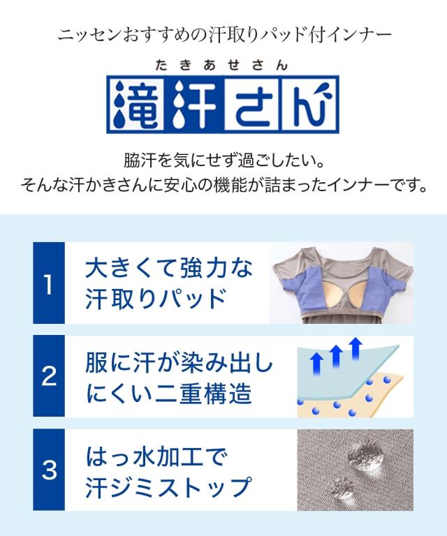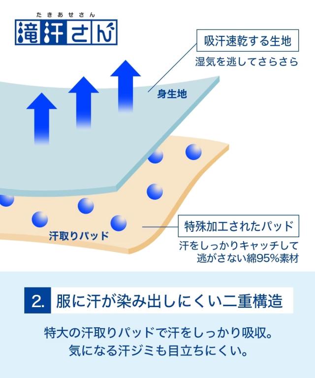 特大汗取り付きインナーシリーズ「滝汗さん」の機能をそのまま、 さらに着心地UP! ポイント1 暑い季節にもさらりと着用できるよう身生地を見直し! ポイント2 汗取りパッドから肩部分のパターンを見直すことで脇へのフィット感UP! 夏の汗染み対策に、「滝汗さん」是非お試しください。 気になる汗染みに即戦力! もう汗を気にしたくない方に向けた特大汗取りパッド付インナー「滝汗さん」 ・夏に汗染みが目立つグレーや色物の服が着られない… ・他人の目が気になって仕方がない… ・電車やバスのつり革や人前に出るシーンなど、腕をあげられない… ・汗染みのことばかり考えて常に緊張状態… そんな脇汗の悩みに終止符を! 「滝汗さん」 累計68万枚を突破した特大汗取りパッド付インナーシリーズ。 脇全体を覆うように設計された特大汗取りパットで汗を逃さずキャッチ! 汗を逃さないその秘密は、特殊な加工をを施した二重構造の汗取りパッド。 肌にあたる部分は汗をさっと吸う綿混素材を、 その裏に撥水加工をすることで汗染みが染み出すのを防ぎます。 身生地は薄手の吸汗速乾素材。 汗をかいても素早く吸収しサッと乾くので快適。 なめらかな肌触りとストレッチ性のある生地で気持ち