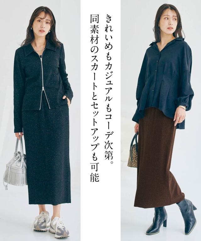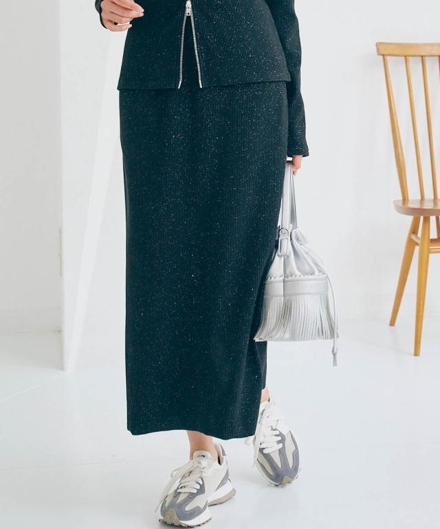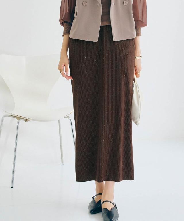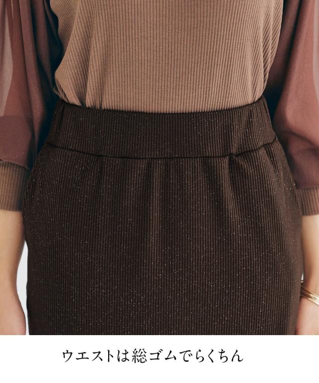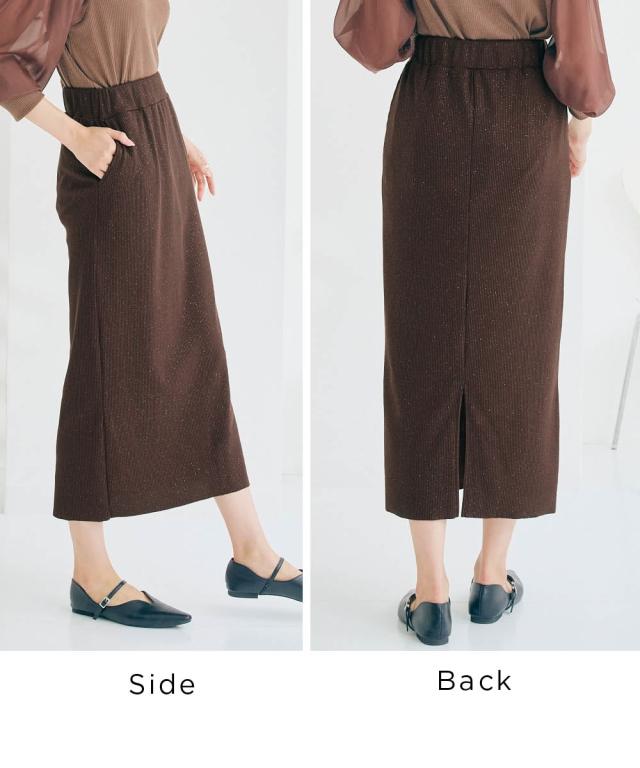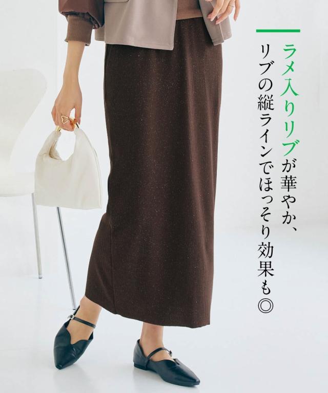 着るだけで華やぎ、周りと差をつけるラメ入り「見映えリブ」動きやすさとスタイルアップを両立!大人の品格が際立つ、ほっそり見映えリブナロースカート。 ■デザイン 細かいラメの風合いが魅力のリブ素材ナロースカート。コーディネートにモードな要素をプラスできる旬の1枚。縦のラインを強調するリブ素材が、気になるヒップや太ももをすっきりと見せ、すらりとした美脚ラインを演出します。バックに入ったスリットは、足さばきの良さを確保しつつ、歩くたびに揺れる女性らしいニュアンスをプラス。ウエストは総ゴムでリラクシーな着心地。同素材の「ラメリブカットソー襟付きWジップトップス」と合わせれば、こなれ感のあるセットアップスタイルが完成。忙しい朝も迷わずおしゃれが決まります。 ■素材 しなやかで伸縮性のあるリブ素材を使用。身体のラインに優しくフィットしながらも、窮屈さを感じさせない快適な着心地が魅力です。ラメを織り交ぜることで、さりげない光沢感をプラスし、上品な華やかさを演出。デイリー使いはもちろん、ちょっとしたお出かけにも映える素材感です。ご自宅の洗濯機(ネット使用)で手軽にお手入れできるウォッシャブル仕様なので、忙しい毎日を送る女性にも嬉し