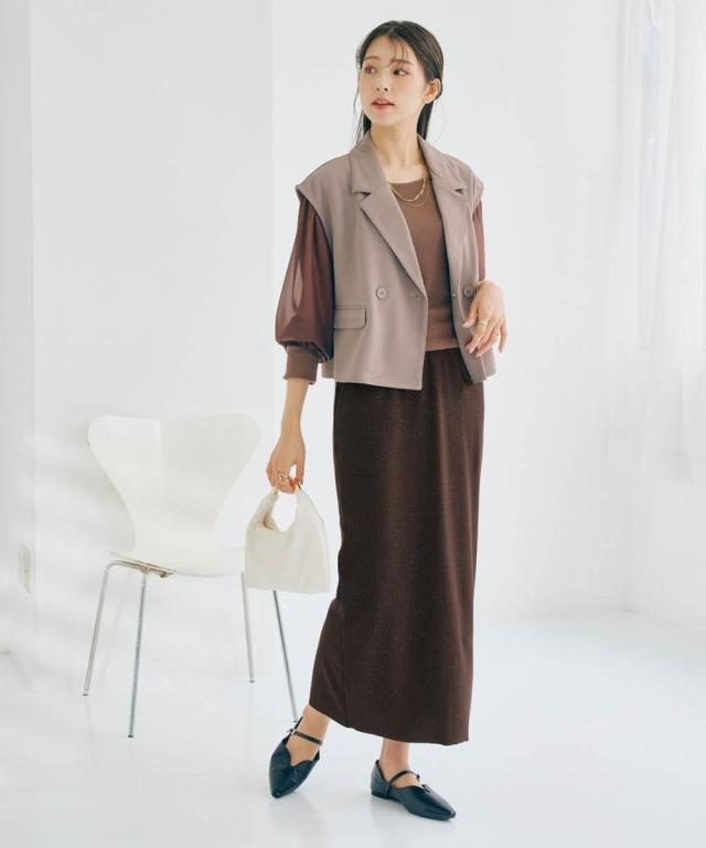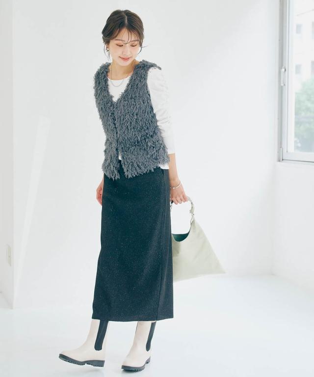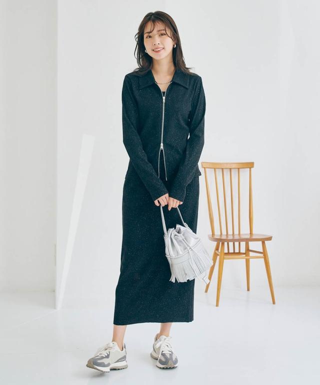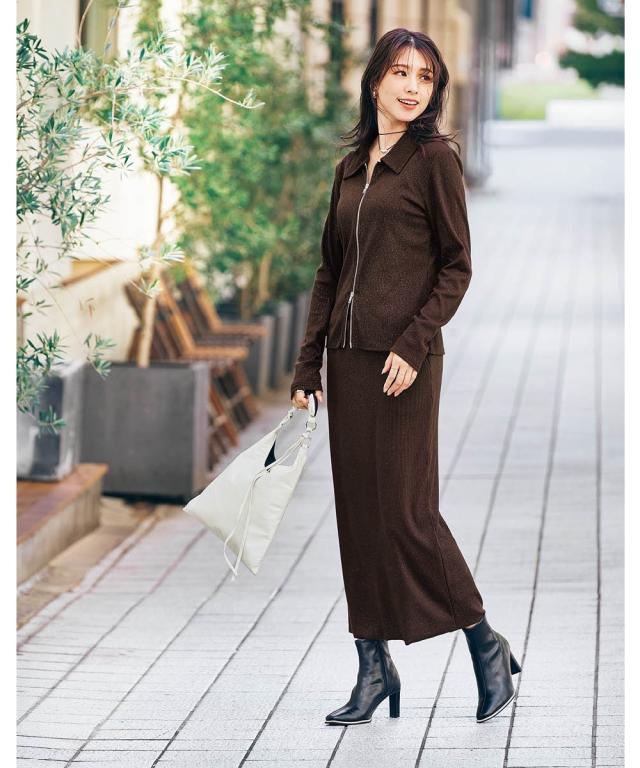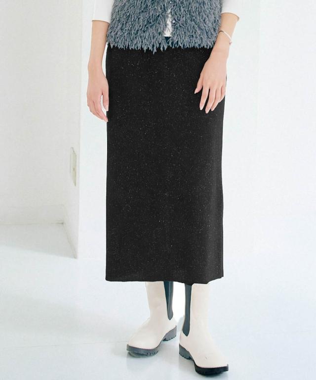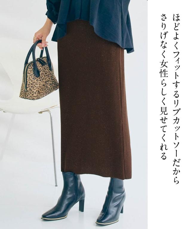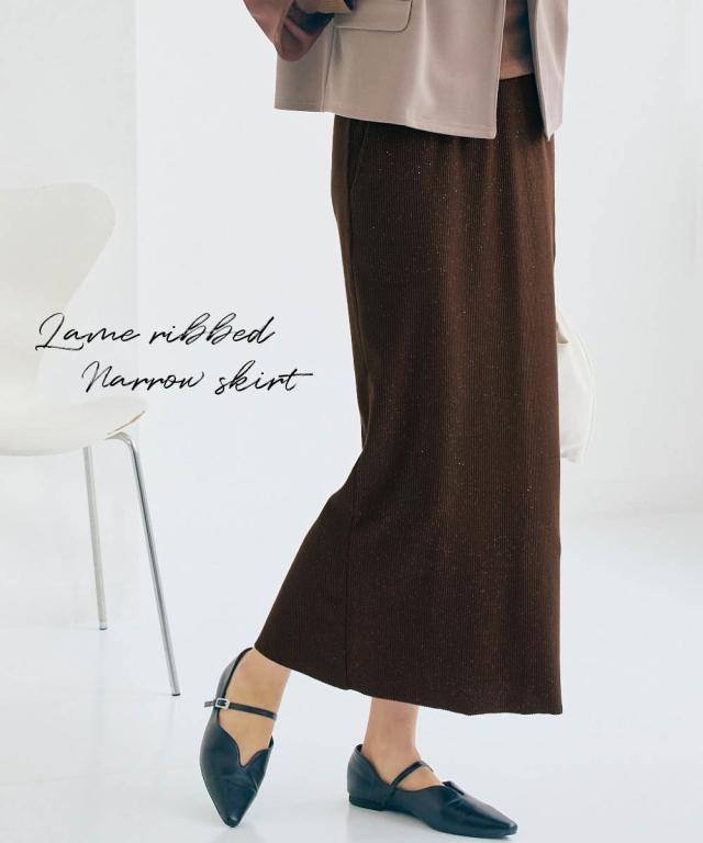 着るだけで華やぎ、周りと差をつけるラメ入り「見映えリブ」動きやすさとスタイルアップを両立!大人の品格が際立つ、ほっそり見映えリブナロースカート。 ■デザイン 細かいラメの風合いが魅力のリブ素材ナロースカート。コーディネートにモードな要素をプラスできる旬の1枚。縦のラインを強調するリブ素材が、気になるヒップや太ももをすっきりと見せ、すらりとした美脚ラインを演出します。バックに入ったスリットは、足さばきの良さを確保しつつ、歩くたびに揺れる女性らしいニュアンスをプラス。ウエストは総ゴムでリラクシーな着心地。同素材の「ラメリブカットソー襟付きWジップトップス」と合わせれば、こなれ感のあるセットアップスタイルが完成。忙しい朝も迷わずおしゃれが決まります。 ■素材 しなやかで伸縮性のあるリブ素材を使用。身体のラインに優しくフィットしながらも、窮屈さを感じさせない快適な着心地が魅力です。ラメを織り交ぜることで、さりげない光沢感をプラスし、上品な華やかさを演出。デイリー使いはもちろん、ちょっとしたお出かけにも映える素材感です。ご自宅の洗濯機(ネット使用)で手軽にお手入れできるウォッシャブル仕様なので、忙しい毎日を送る女性にも嬉し