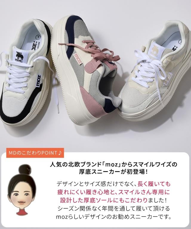 【大人気北欧ブランドmoz】人気のmoz(モズ)からスマイルワイズの軽量厚底スニーカーが登場!厚底ソールはスマイルさん専用に設計。デザインとサイズ感だけでなく、長く履いても疲れにくいよう軽さにもこだわっています。シーズン関係なく年間を通して履いて頂けるモズらしいデザインのお勧めスニーカーです。 ■ポイント ・さりげなく足長効果を期待できるのも嬉しいボリュームソール ・内側メッシュで優しい履き心地 ・かかとクッションで靴擦れ軽減 ・取り外し可能なカップインソール ・カラーによって異なる配色のエルクのマークとmozのブランドロゴ入り 【ニッセンオリジナルの大きいサイズ規格】 本当に合う靴に出会った事はありますか ニッセンの4Eは、靴底の幅を広げ、甲や足首周りもゆったりの独自設計。 靴のサイズにお悩みのお客様へ向けて、サイズが大きくてもバランス良くきれいに見えるよう企画したオリジナルシューズです。