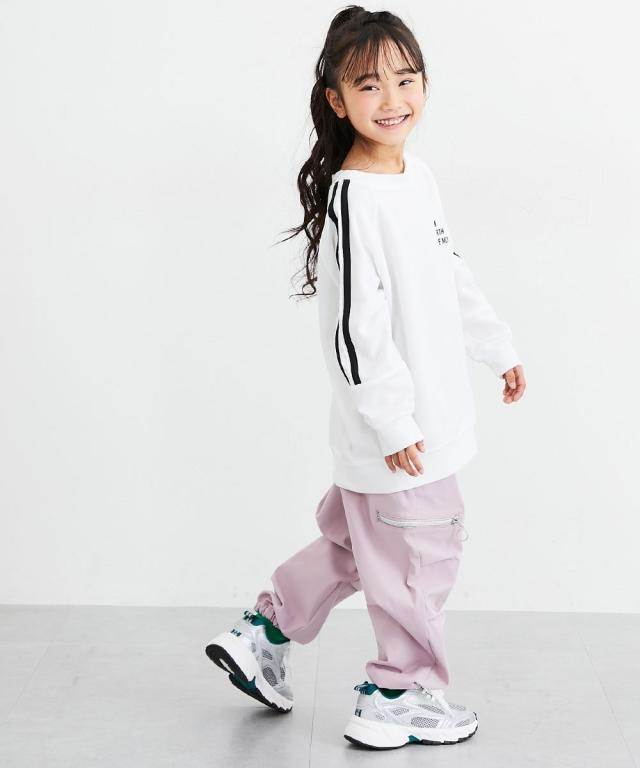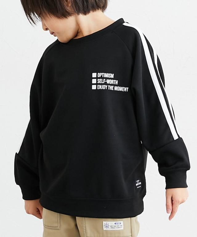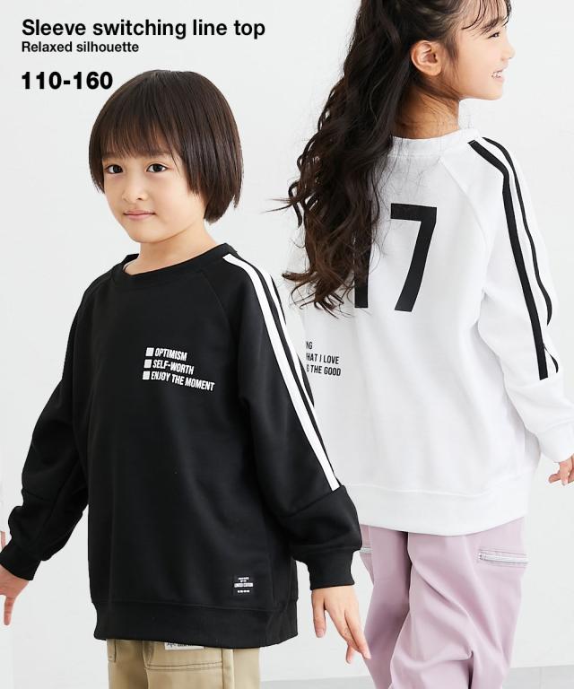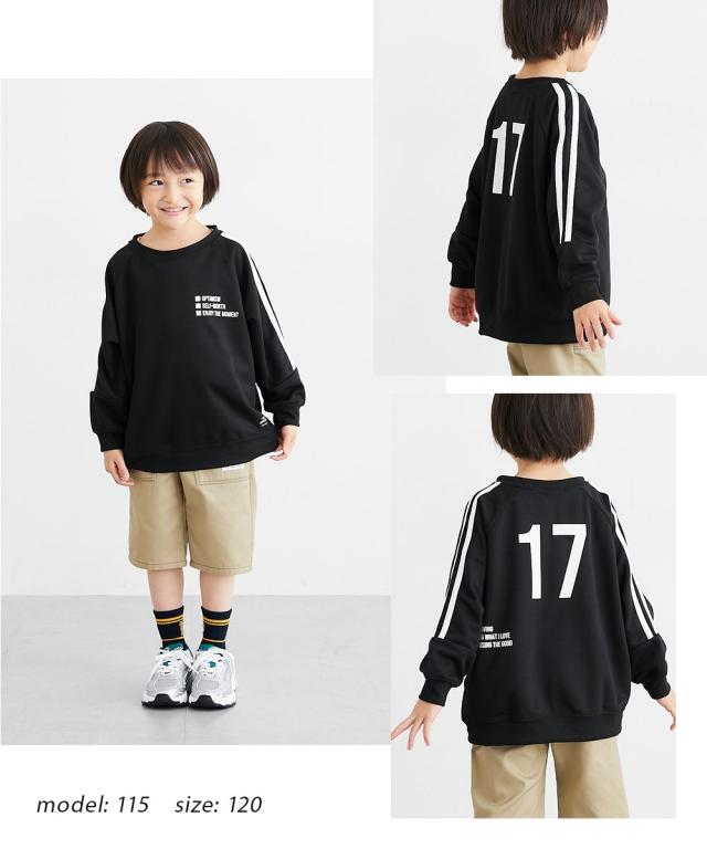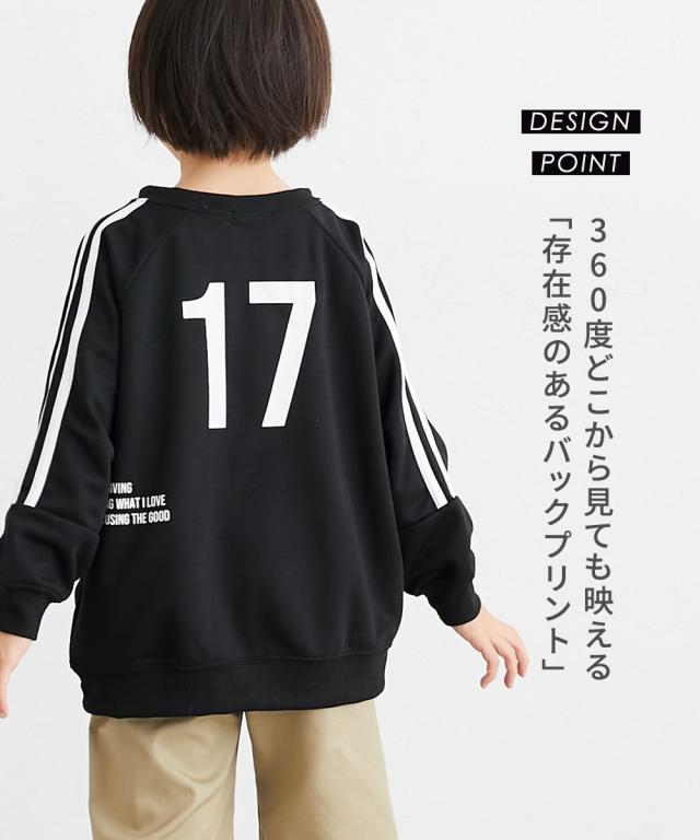 一着でおしゃれが決まる! スポーティーさとストリート感を絶妙にミックスした袖切替ライン使いトップスが登場。 肩から袖にかけてのラインデザインと、背面の大きな17のナンバリングプリントが、後ろ姿まで抜かりなくかっこいいを演出します。 男女問わず着こなせるオフホワイトとブラックの2色展開。 通学から休日のお出かけまで、毎日のコーディネートの主役として活躍すること間違いなしの万能アイテムです。 ■デザイン ・肩から袖口にかけて走るラインが、アクティブで現代的な印象を与えます。袖の切替パーツにより、単調にならない立体的なシルエットを実現し、動きやすさとファッション性を両立させました。・背中には大きく17の数字をあしらい、バックスタイルにスポーティーなアクセントをプラスしました。どこから見てもスタイリッシュな印象を与え、お子様の個性を引き立てる主役級のデザインです。・胸元と腰部分にさりげなく配された英字ロゴが、全体をクールに引き締めます。オフホワイトとブラックの2色展開は、どんなカラーのボトムスとも合わせやすく、日々のコーディネートに重宝します。■素材 ・なめらかな肌触りと上品なハリ感が魅力のポンチ素材を採用しました。スウェット生