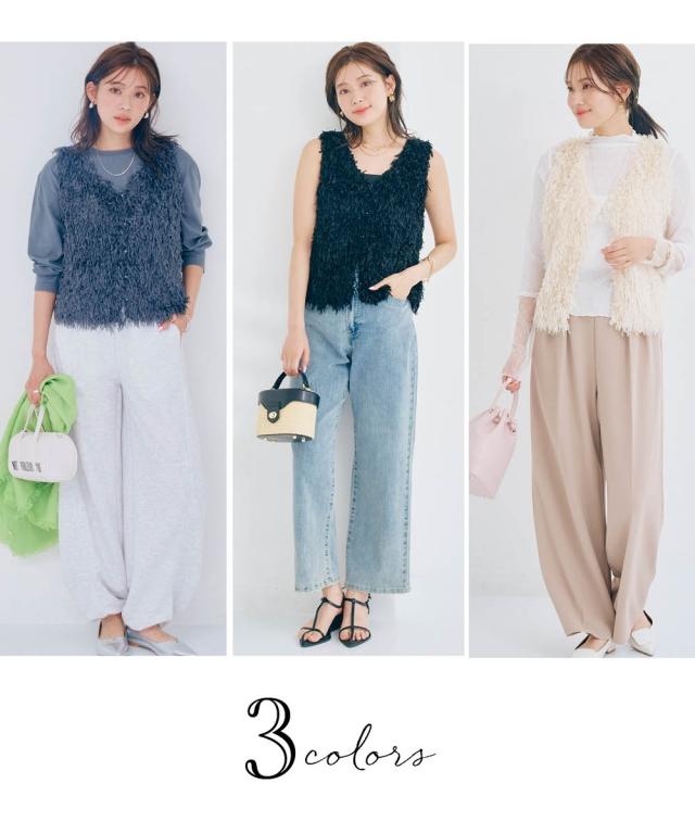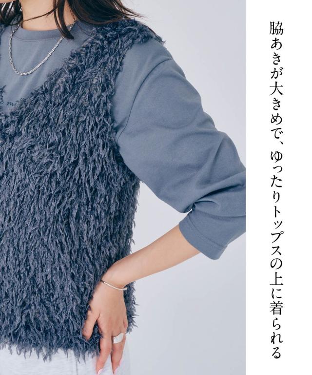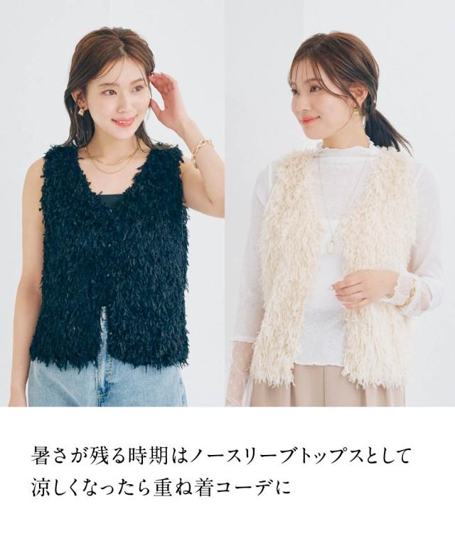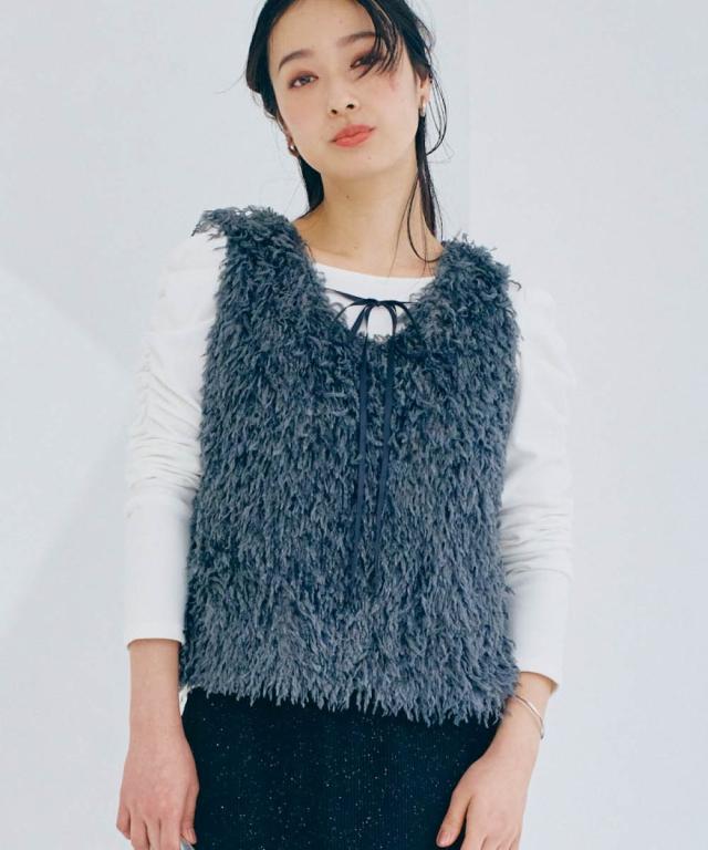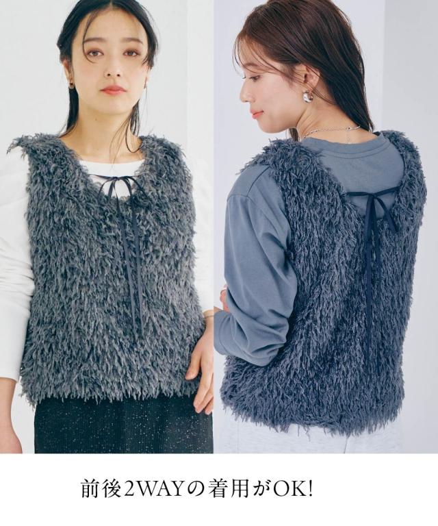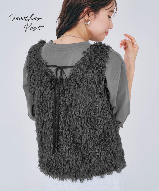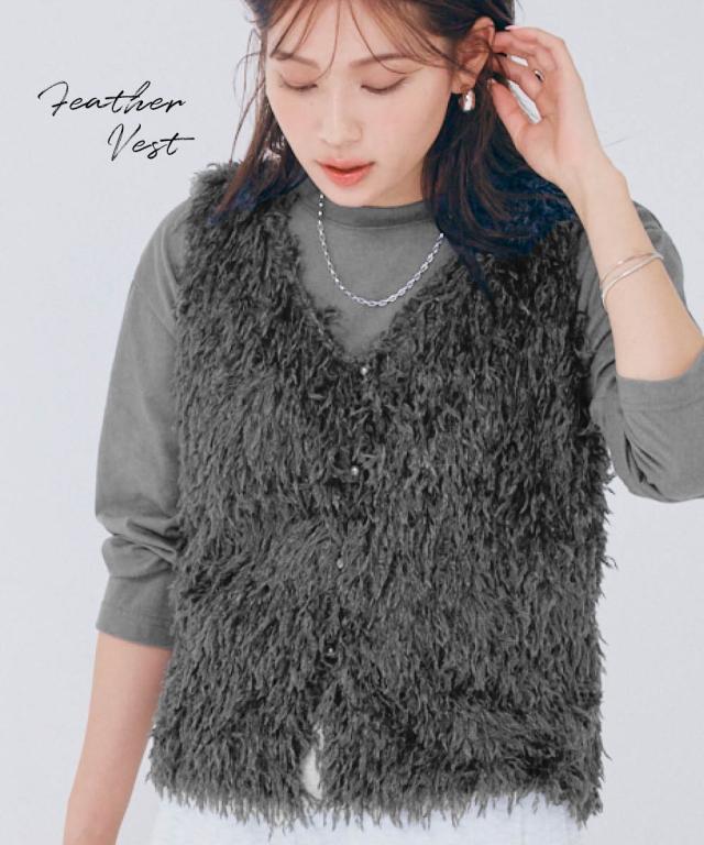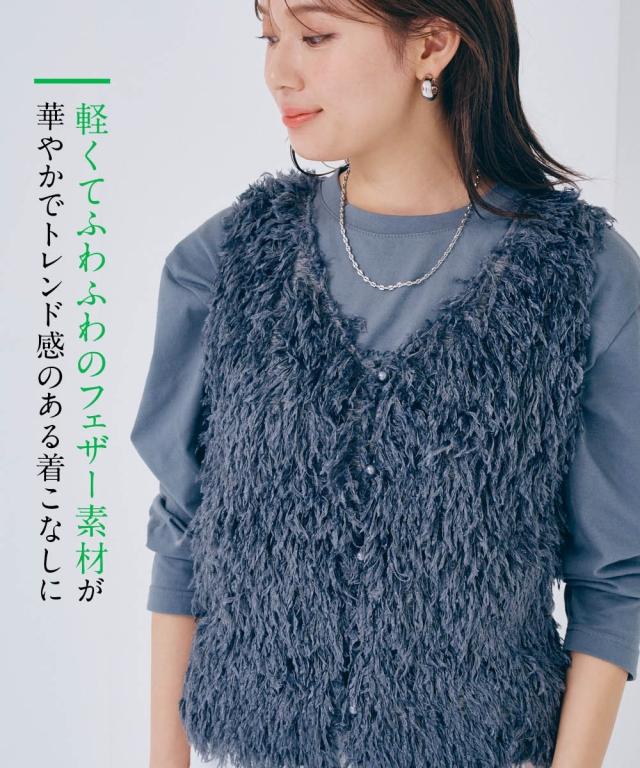 羽織るだけで、コーデを格上げしてくれる2WAYフェザーベスト前後2WAYで着られるから、その日の気分やコーディネートに合わせて気回せる! ■デザイン ふわふわとしたフェザーのような素材感が目を引く、トレンド感満載のベスト。最大の魅力は、前後2WAYで着用できるデザイン。ボタンを前にしてカーディガン風に、あるいはボタンを後ろにしてプルオーバー風にと、着こなしの幅がぐっと広がります。Vネック側は、長めのサテンリボンがデザインポイント。インナーを選ばずすっきりと着こなせ、気になる腰回りをさりげなくカバーしてくれる丈感も 程よいボリューム感がありながらも、着膨れしにくい計算されたシルエットは、大人の女性が求める上品さと体型カバーを両立。カジュアルなTシャツスタイルに羽織るだけで、一気にこなれた印象を与え、いつものコーディネートを格上げしてくれます。 ■素材 ふんわりとした柔らかな肌触りが魅力のフェザー素材を使用しています。軽やかな着心地で、肩への負担も少なく、長時間着用してもストレスフリー。デリケートな素材でありながらも、ご自宅で簡単にお手入れできるのは嬉しいポイント。毛足の長いフェザーが、動くたびに揺れて表情豊かな印象を与え、シン
